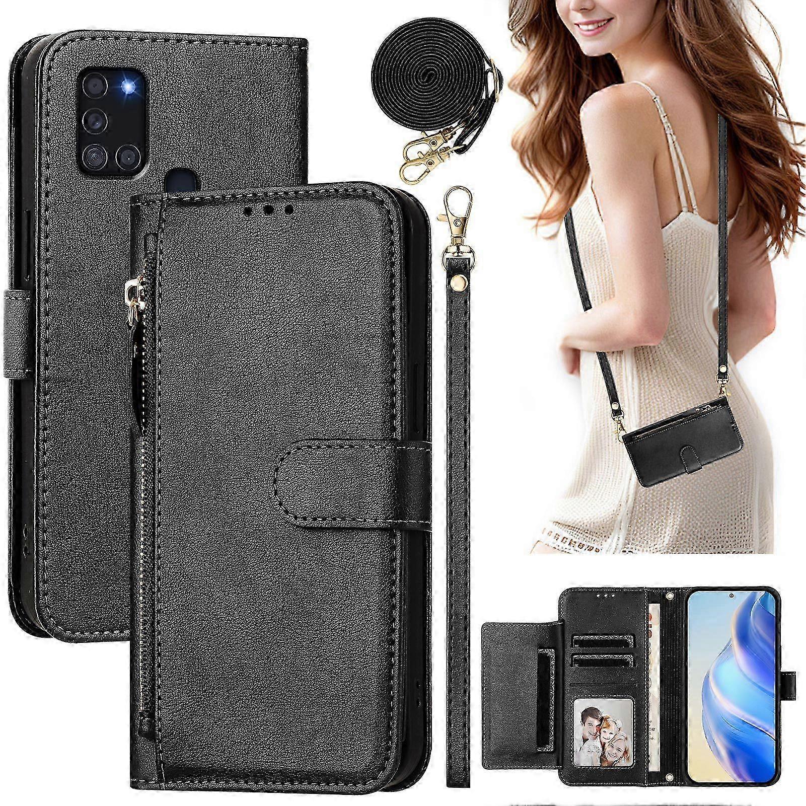 Galaxy A21S Flip Case with Zipper, Card Holder & Long Strap - Soft PU Leather Protective Wallet Cover