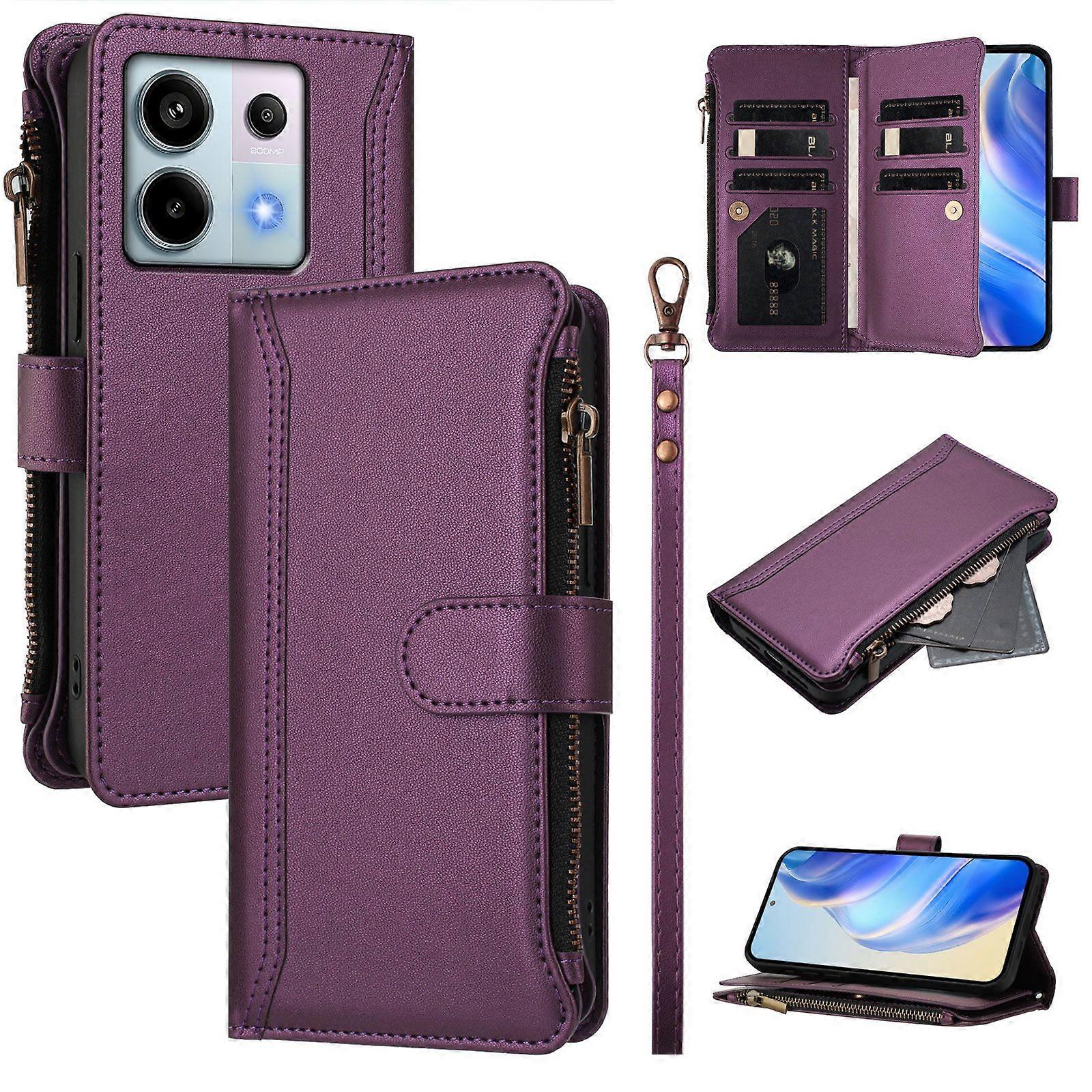 Case for Xiaomi Redmi Note 13 Pro 5G Premium Leather Zipper Pocket Wallet Phone Case with 9 Card Slots and Detachable Wrist Strap