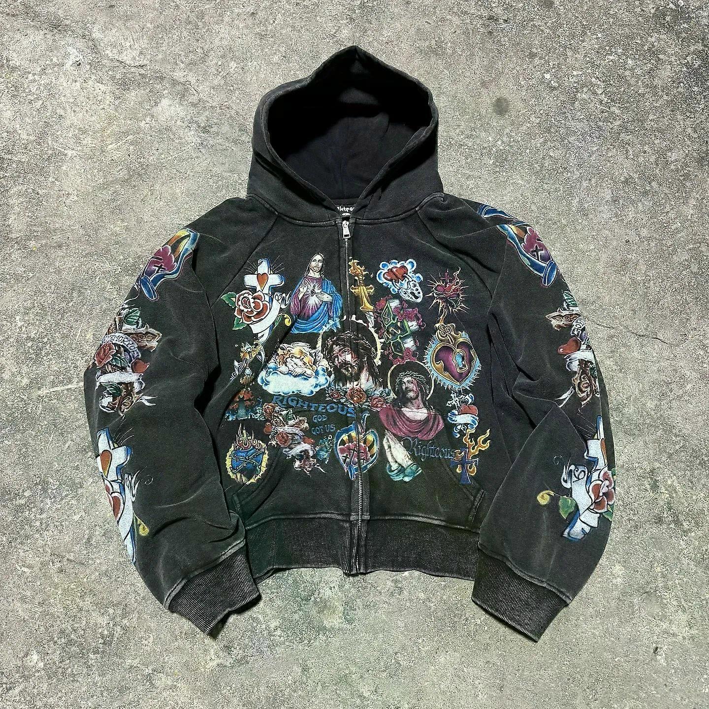 High Quality Y2k Retro Black Risen King Cropped Zip Up Hoodie Gothic Graphic Washed Hoodies for Men Women Sweatshirt Streetwear