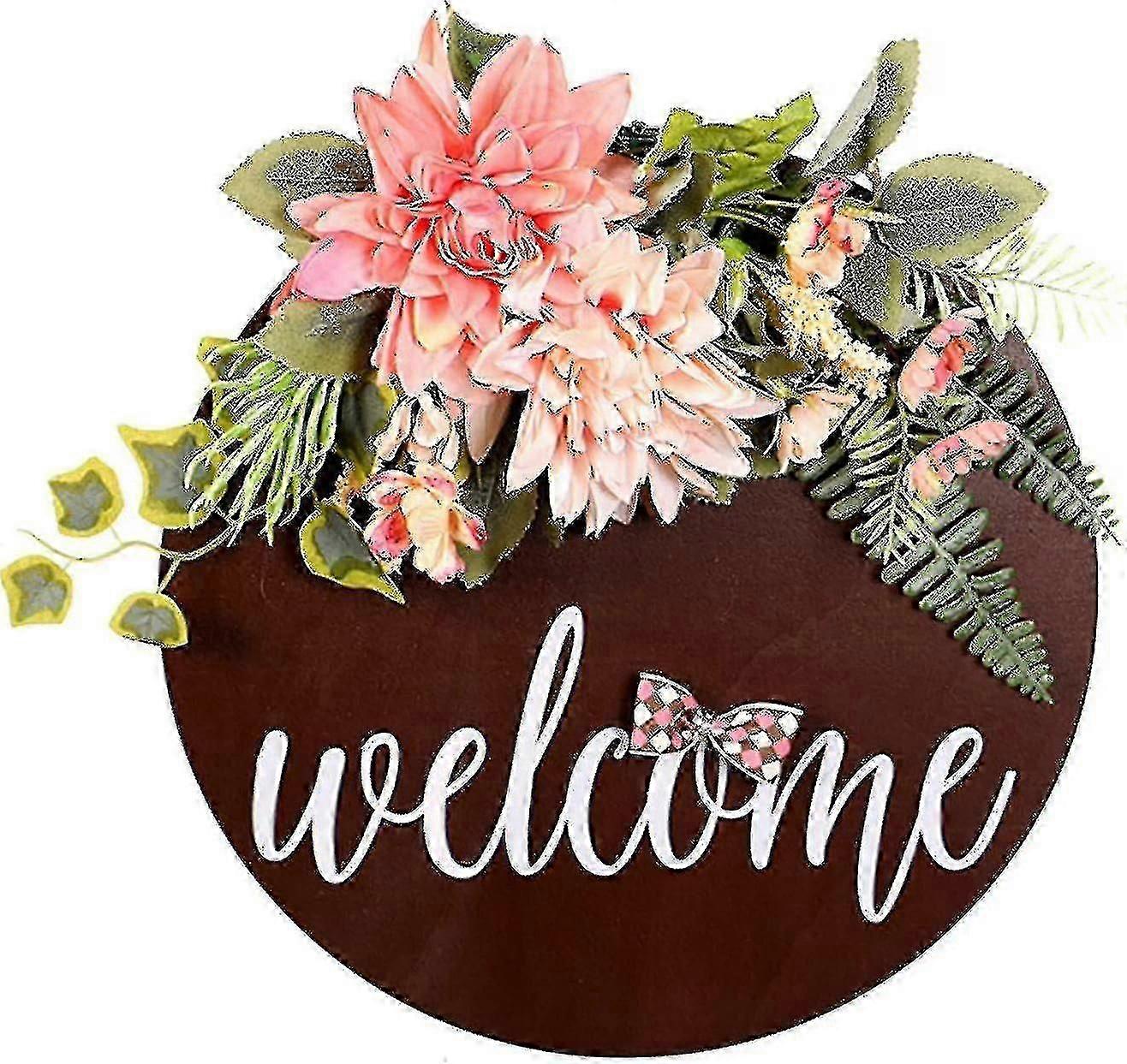 Round Wooden Welcome Wall Plaque With Artificial Green Dahlia For Entrance Door Bar Decor