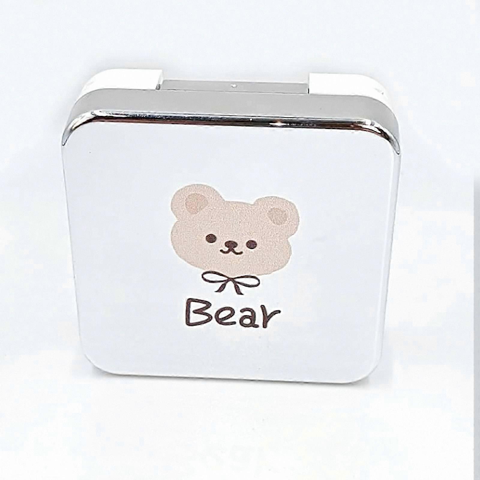 Portable Contact Lens Case with Mirror, Cute Bear Design, Silver Reflective Cover, White Bottom, Travel-Friendly Lens Storage Kit