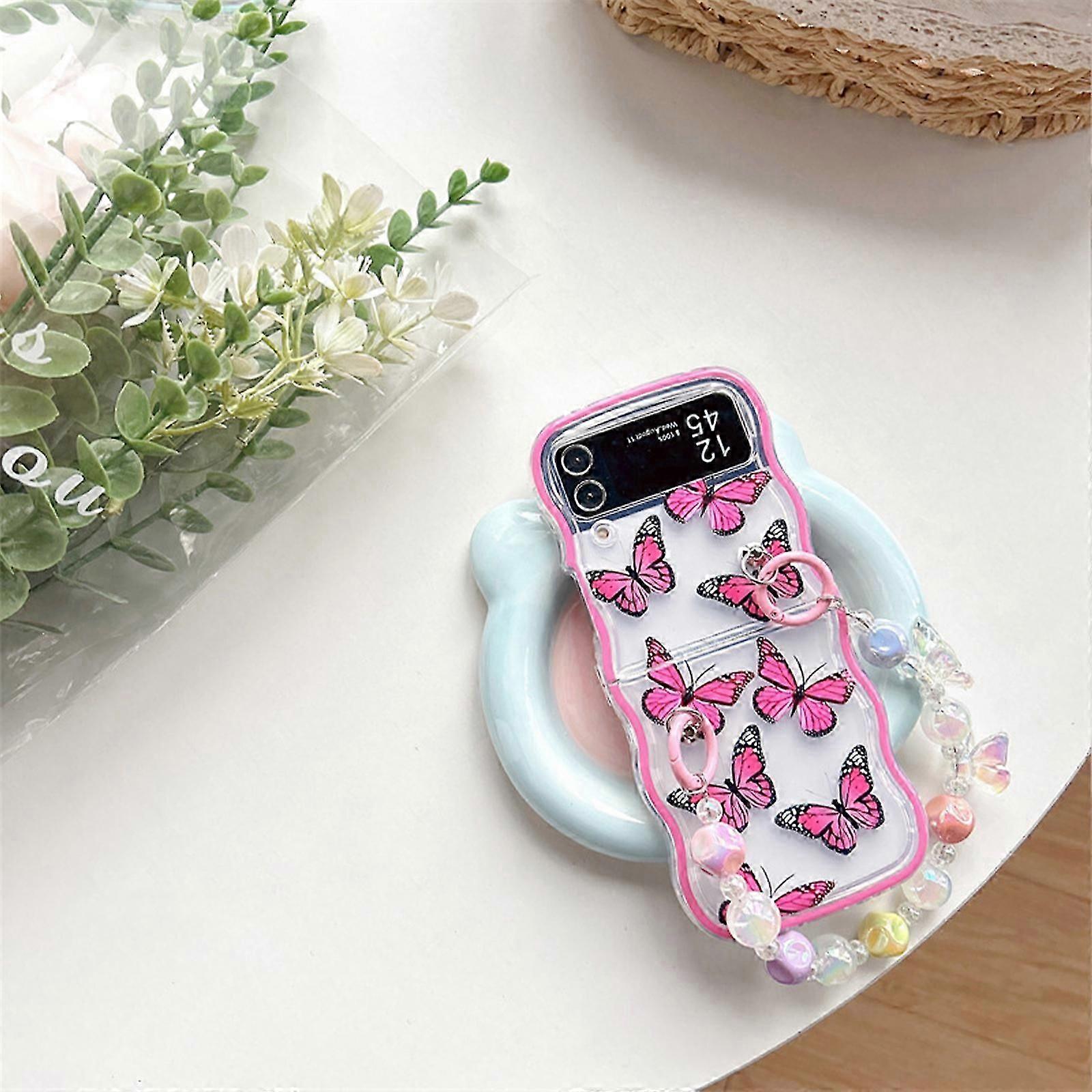 Case for Samsung Galaxy Z Flip 5 with Wrist Strap, Flower Butterfly PC Case Galaxy Z Flip 5, Wave Shell Case for Samsung Z Flip 5