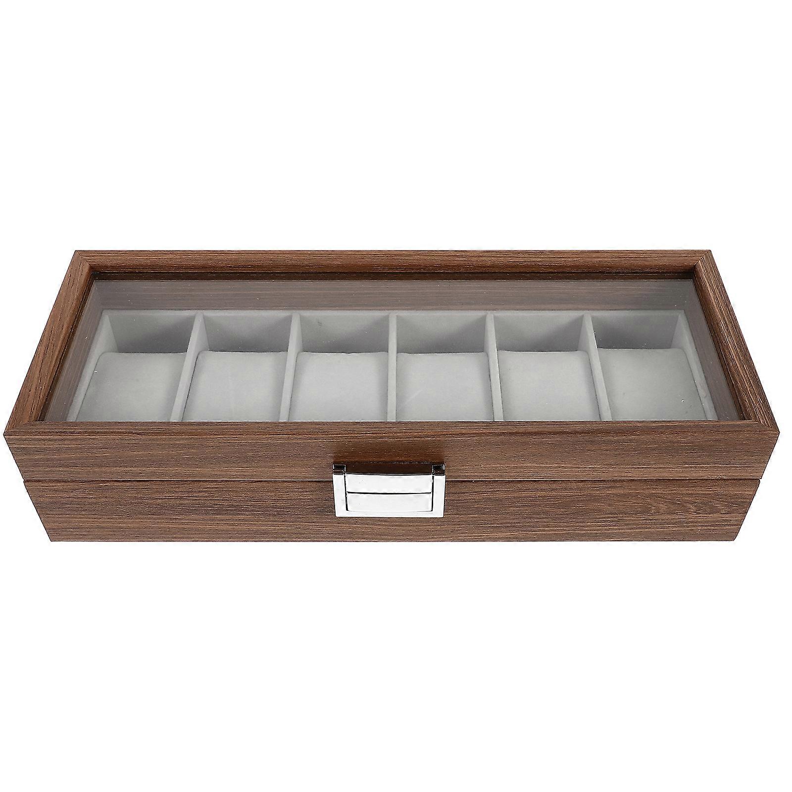 This is a fashion and portable storage box, applying for watches as well as jewelry. It keeps all your beloved watches and jewelry well-organized, easy to find, and beautifully displayed when you store them in this box. With separated cells, the watch box can hold 6 watches. Closure design to well keep dust . Features -Color:Multi -Material:Wood,metal,lint,glass -Size:31.00X12.00X7.50cm/12.18X4.72X2.95in -Sturdy structure and good workmanship ensure this delicate watch box durability and practicality. -Feature with fine workmanship and details, this delicate watch box is not easy to damage and break. -Perfect for organizing watch, bracelets, necklaces and other small jewelry. Meet your different using needs. -Protects your watch and scratches, great for protecting and displaying your items. -Display your watch or jewelry in the store or dressing table, fit for home, jewelry shop, etc. Package list: 1 box