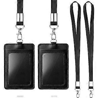 Badge Holders, Vertical PU Leather ID Badge Card Holders with Clear ID Window and Detachable Neck LanyardBlack2 Pack
