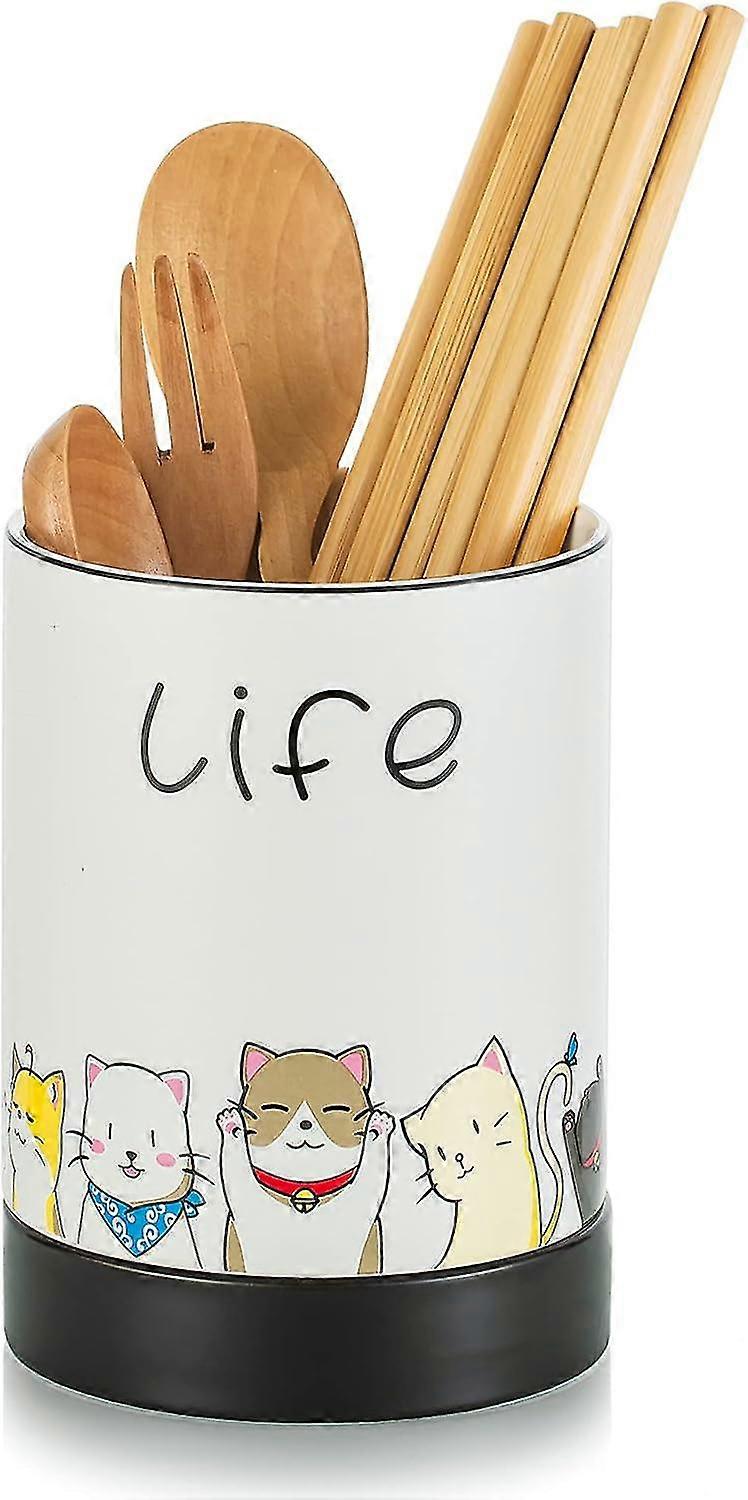 Kitchen Utensil Holder, Ceramic Cutlery Holder with Cute Cat Pattern, Practical Kitchen Utensil Organizer for Cutlery, Perfect Gift for Party, White