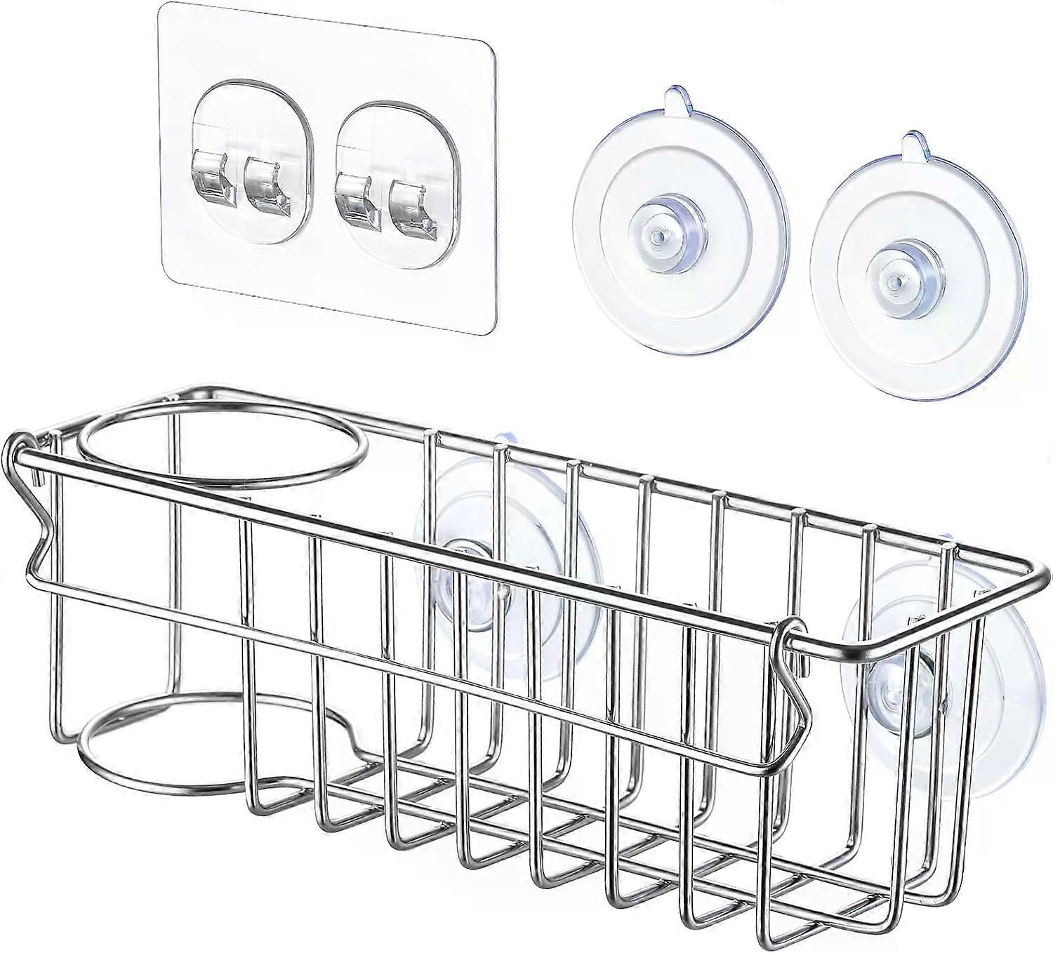 3-In-1 Sponge Holder, Kitchen Sink Organizer with Suction Cups & Adhesive Hook, SUS 304 Stainless Steel