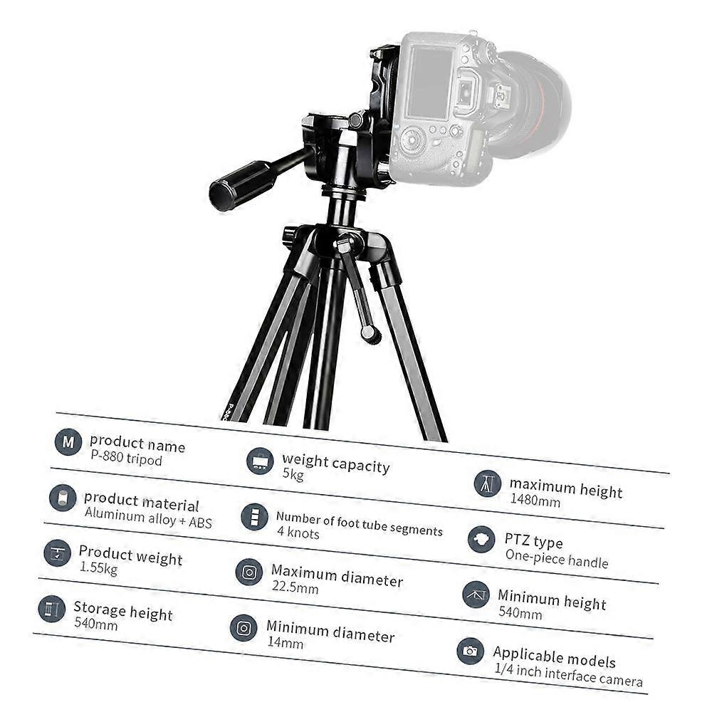 Feature:1. This portable tripod stand, made of lightweight aluminum alloy material and with 54cm folded height, is suitable for outdoor and travel photography.2. Max. load capacity is up to 5kg/11lbs, which makes it work well with most DSLR/ILDC camera, digital camera, DV, mini camcorder, smartphone, etc, quite wide applications.3. The 3-way tripod head supports 90° vertical and 360° panorama shooting, and the handle enables you to adjust usage angle freely for more flexible shooting.Specification:Features:This portable tripod stand, made of lightweight aluminum alloy material and with 54cm folded height, is suitable for outdoor and travel photography.Max. load capacity is up to 5kg/11lbs, which makes it work well with most DSLR/ILDC camera, digital camera, DV, mini camcorder, smartphone, etc, quite wide applications.The 3-way tripod head supports 90° vertical and 360° panorama shooting, and the handle enables you to adjust usage angle freely for more flexible shooting.4-section telescoping octagonal legs with anti-slip rubber feet, more durable and more stable, and the max. usage height of the tripod is up to 148cm/58.2in.With gravity hook to increase tripod stability by adding extra weight; bubble level to help you find the balance accurately and quickly.Specifications:Color: BlackMaterial: Aluminum Alloy + ABSFolded Height: 54cm/ 21.3inMaximum Usage Height: 148cm/ 58.2inMinimum Usage Height: 51cm/ 20inLeg Sections: 4 SectionLeg Diameter: max. 22.5mm, min.14mmMax. Load Capacity: 5kg/ 11lbsConnecting Screw: 1/4 inch screwItem Weight: 1550g/ 3.4lbsNote:The camera, smartphone and phone holder showed in the picture are not included.Package List:1 * Tripod1 * Carry BagPackage List:1 * Tripod1 * Carry Bag