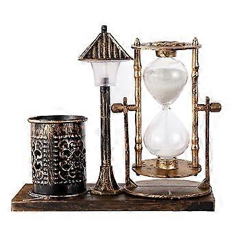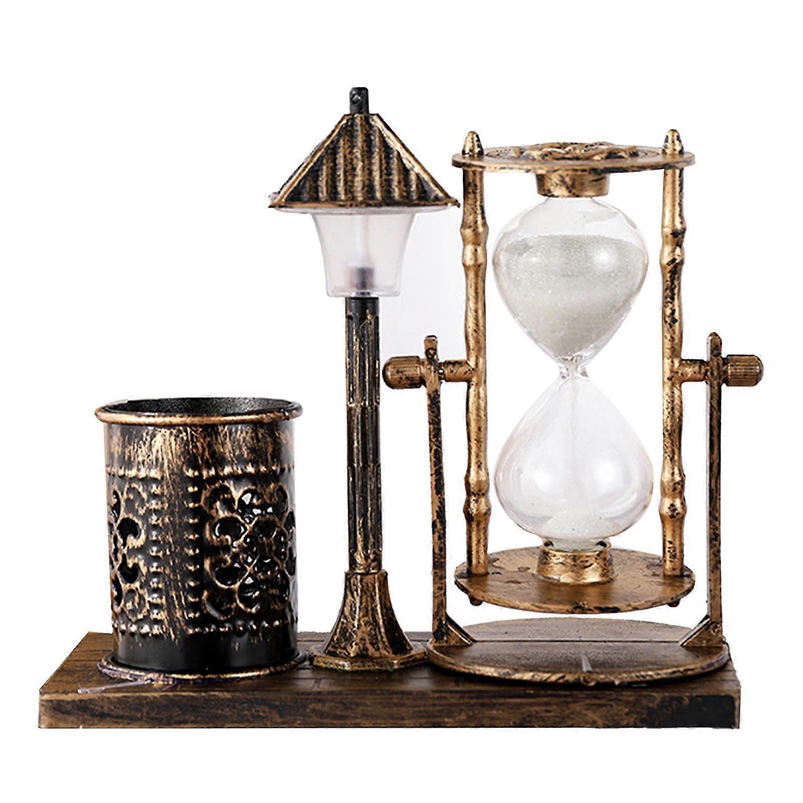 Vintage White Hourglass Pen Holder with Light Street Lamp Design for Office Desk Gold Accent Decorative Organizer