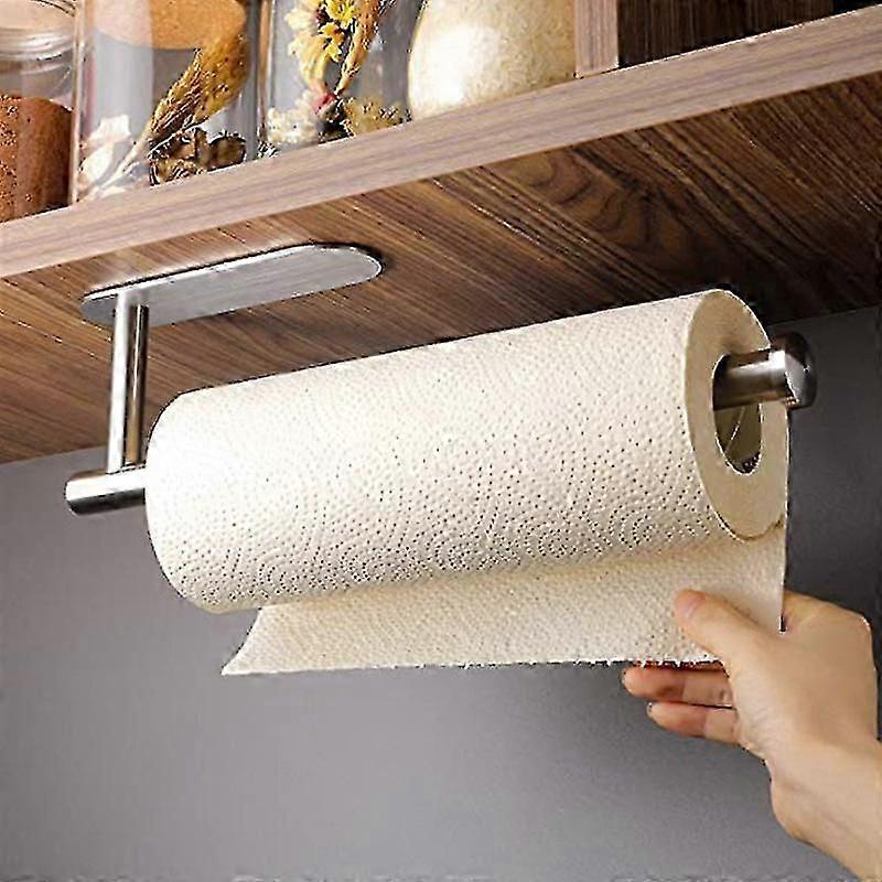 Material: SUS-304 stainless steel, rustproof and waterproof.Dimensions: 34 x 4.5 x 7 cm. The roll holder is suitable for most standard size roll paper.Space saver: Kitchen roll holder can standing install on the wall or it can stick horizontally under the cupboards to save valuable countertop room.Strong adhesion: Self-adhesive tape provides strong adhesion, making it more firmly fixed. (not suitable for wallpaper or painted walls)Easy to install: Mark the location before installation, then just tear off the adhesive film and stick it on a smooth wall surface, then hold it down for a few seconds, finally wait another 24 hours before hanging items.