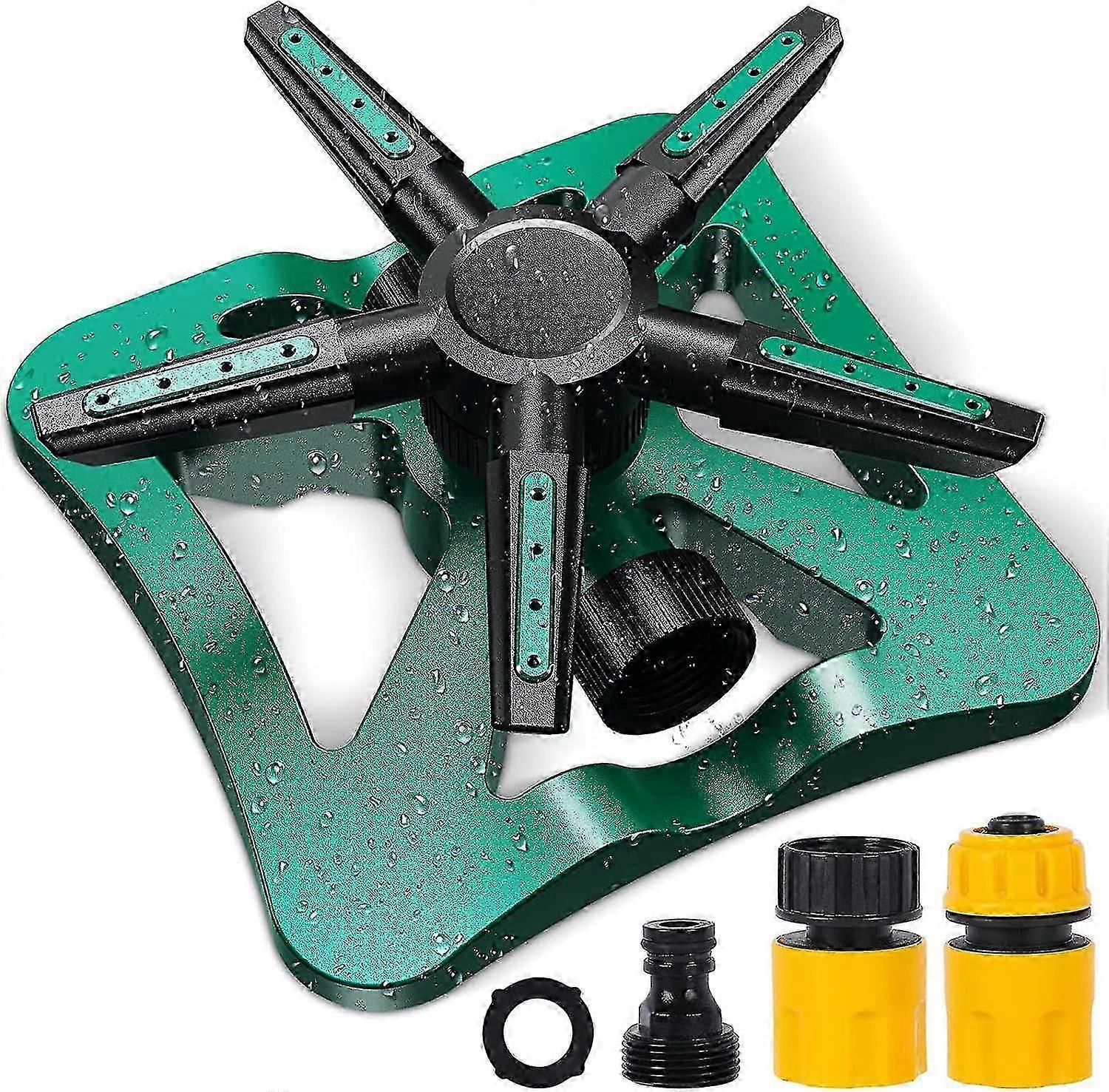 Description [5 Arms 360 Rotation] The all-new 2022 version features 5 arms with 20 built-in nozzles, creating a fine, even, rain-like stream of water to achieve precise and efficient irrigation. 360 degree rotation allows plants to be watered properly rather than flooded. [High speed and large coverage] Adjust the arms with four nozzles (inclined 90, 75, 45, 30) to customize spray angle and watering range, covering plantings at different scales. Upright for maximum, concentrated water spray for a small area and a 30 angle for the greatest coverage area for large areas. [Durable material and reliable construction] Made with ABS material, the garden sprinkler is distinguished by its durability, good flexibility and strong rust resistance, withstanding long exposure to summer sun. Remains stable even under high water pressure, preventing swaying or spilling. Rest assured that every drop of water is fully utilized. [Easy to Use] Ready to use with no installation required. Supplied with a connector for the pipe without thread. Connect to a threaded hose or use the included connector for instant irrigation. Can provide simultaneous watering with multiple lawn sprinklers connected in series for large watering areas. [Wide Application] Perfect for watering flowers, grass, vegetables and any other plants. This powerful sprinkler does more than just irrigate, spraying water on dry, warm soil to cool it down, or use it as a watering toy for kids or pets on the lawn or for cooling a trampoline during summer days.