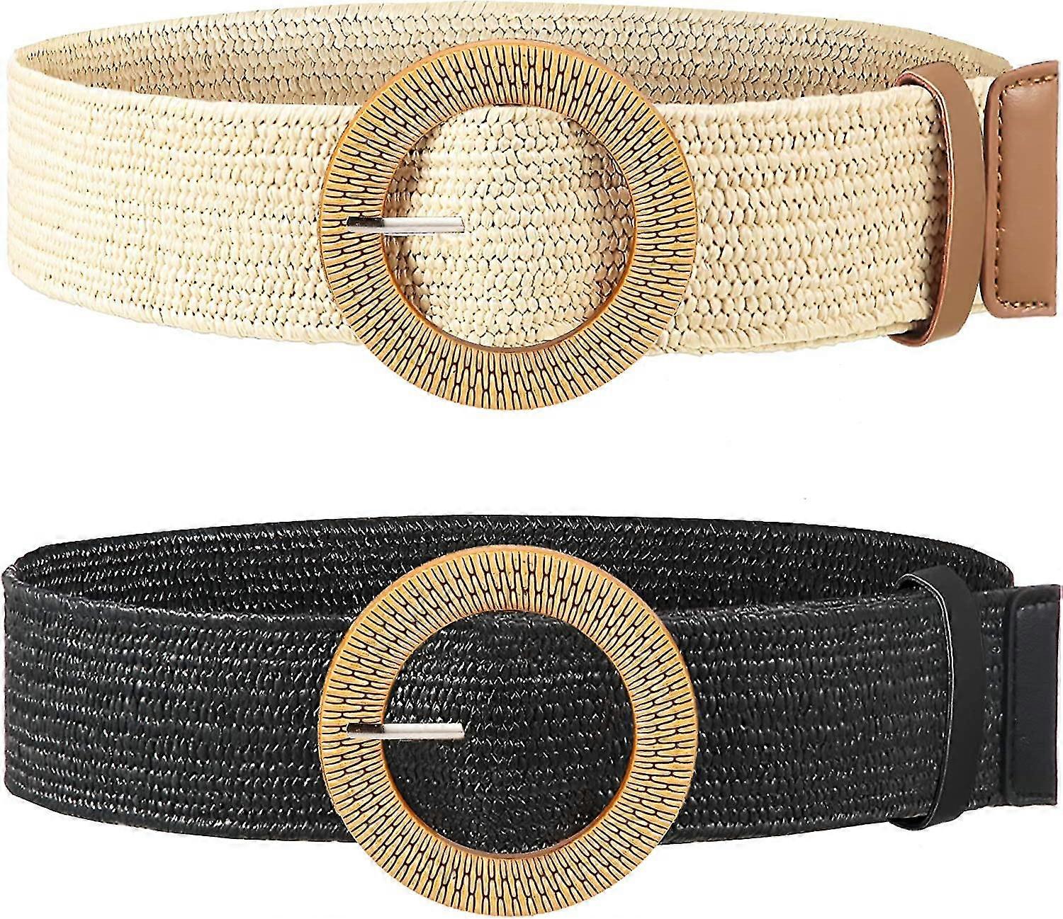 Women Skinny Dress Belt, Fashion Straw Woven Elastic Stretch Waist Band Wood Buckle Belt, Fashion Straw Woven Elastic Belt
