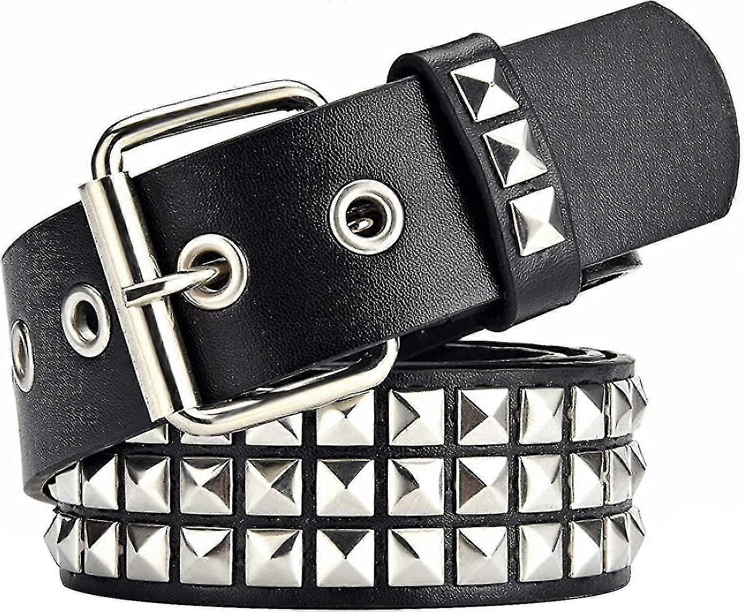 Studded Belt, 3 Row Metal Pyramid Square Beads Punk Leather Belt, Women Men Studded Jeans Belt. (black) - -