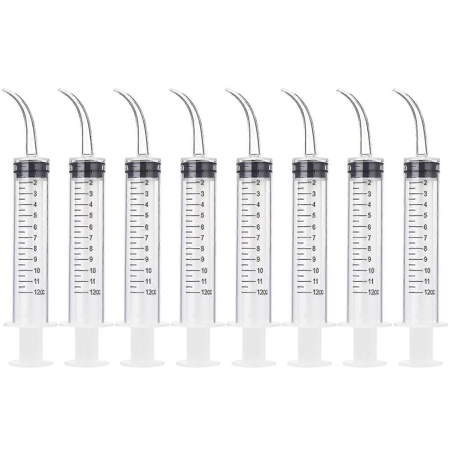 Easy to use: the plunger of this syringe fits well, easy to push down and pull up, won't detachedCurved tip: works well to get into small spaces, can reach places where your floss and toothbrush can't reachWith measurements scale: transparent body with measurement scale, you can see the capacity of liquid insideWide usage: suit to wash teeth after oral surgery, handy tool for irrigating cuts and abrasions when you are traveling, also suit for glue filling when doing craft work, or feeding medicine for your petsPackage includes: 8 pack in total, can use different one for different usage, or you can share some with your family members or friends who need it