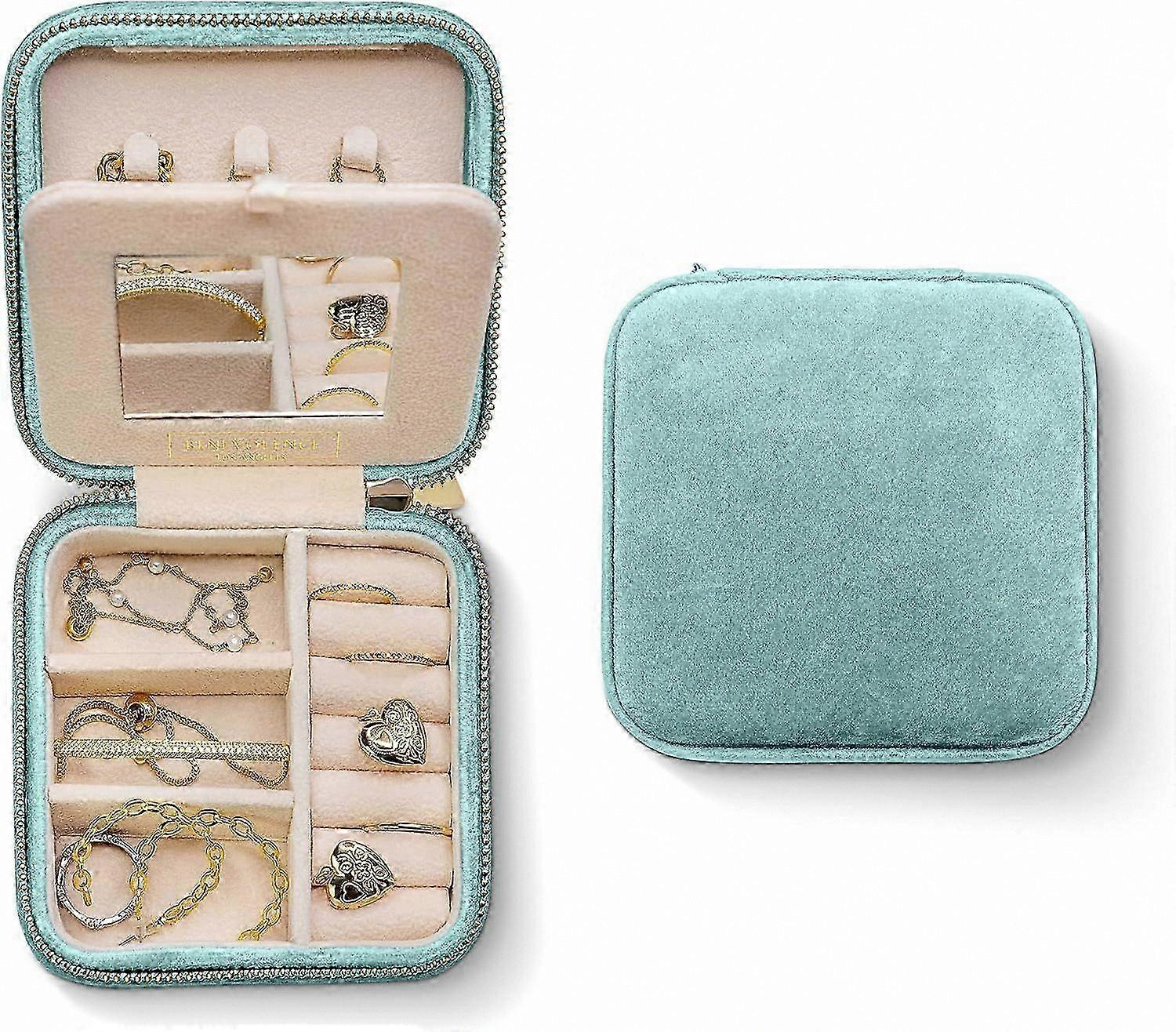 Velvet Jewelry Travel Case with Mirror | Portable Organizer Box for Women | Cyan Blue