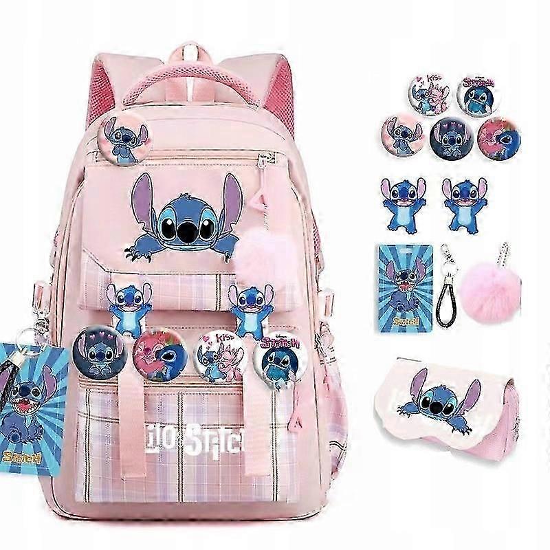 Perfect gift for Stitch fans. Suitable for school, travel, street or outdoor activity support. Adjustable and comfortable shoulder straps, comfortable on the left and right side. Size: 42*30*23cm. Gifts: same pencil case, 5 badges, 2 patches, card case, hairball pendant