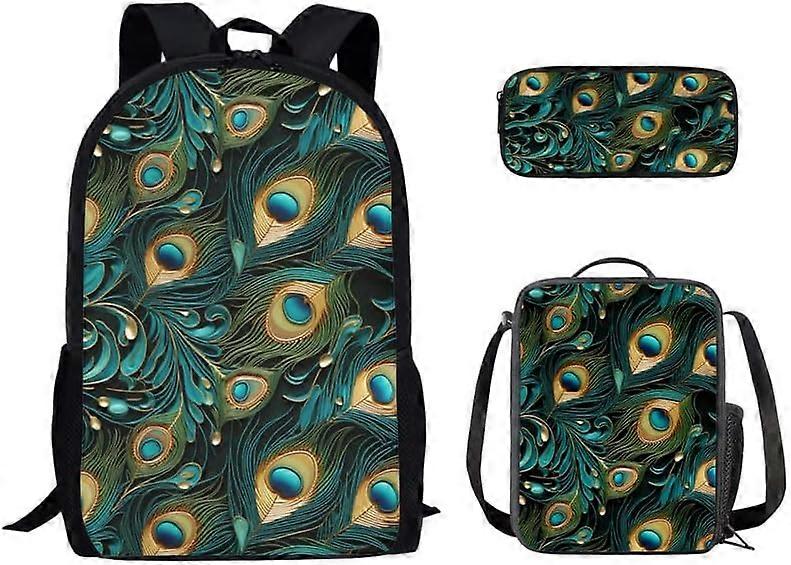 Peacock Feathers School Bag Backpack for Middle Students Turquoise Peacock Casual Daypacks Backpack 3Pcs Set Boho Feather Spiral Bookbag with Lunch Ba