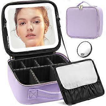 Makeup Bag with Mirror and Light, 3 Color Adjustable Brightness, 10x magnifying glassUSB charging & 2000mah battery capacity(Purple)