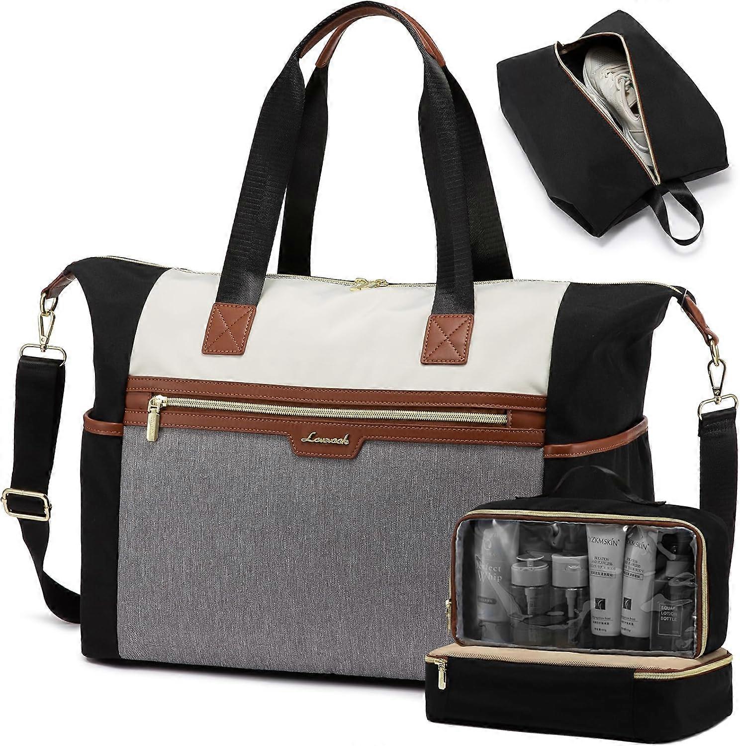 Women's Weekender Bag, 4-Piece Travel Duffel Set with Shoe Bag, Toiletry Bag and Clothing Organizer, Carry-On Luggage with Wet Bag, Black and White
