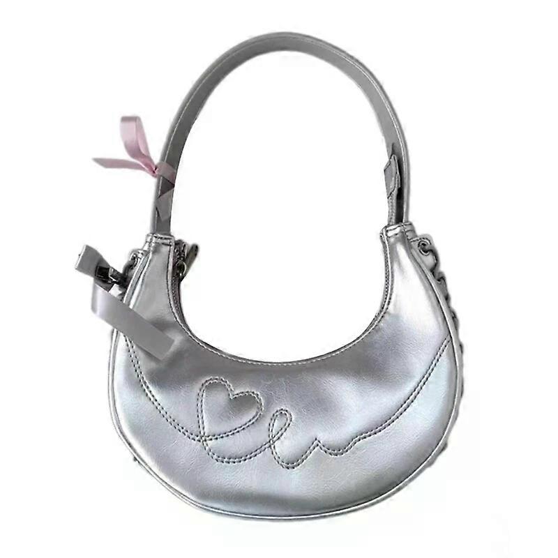 Functional for daily essentials. Features silver PU leather, half moon shape, armpit/shoulder carry. Stylish, durable, lightweight, versatile—ideal for shopping, dates, parties, daily outings.