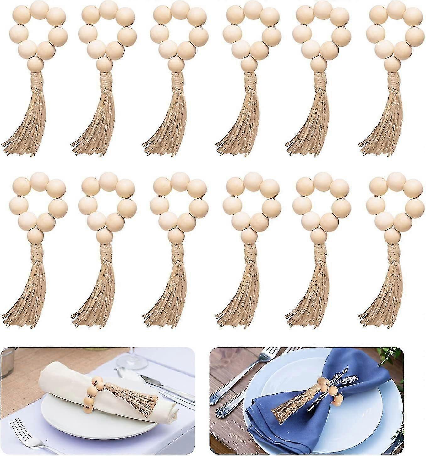 Napkin Rings Set Of 12, Handmade Wood Bead Napkin Holder Ring With Rope Tassel Tabletop Decor For Dinning Table Setting, Party, Wedding, Family Gather