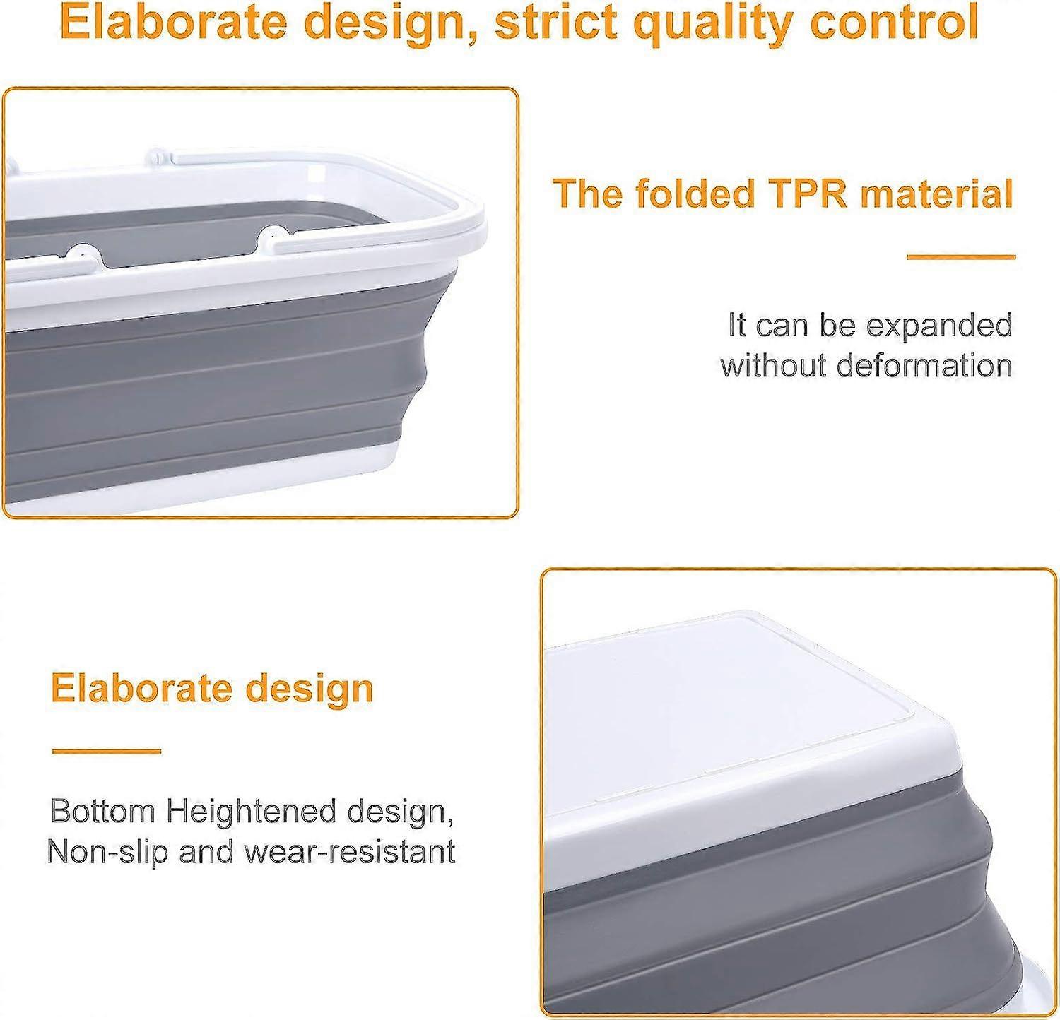 PREMIUM POLYCARBONATE and BPA FREE collapsible sink made of premium polycarbonate + flexible thermoplastic rubber (TPR) construction that is BPA free and dishwasher safe. Polycarbonate the heat and impact resistance, wear resistance of materials, better than abs plastic material. better material great value for money MULTIFUNCTIONAL USE, INNOVATIVE DAILY NECESSITIES Foldable sink variable size, light weight and easy to use, can be folded and unfolded in one second, very suitable for indoor or outdoor use. it can be used to wash dishes, fruits, vegetables, clothes, and even wash cars at the campsite. Also be used as a bucket, ice bucket and picnic basket. You can use it while camping, hiking and boating. Great assistant in daily life, environmentally friendly, convenient, and portable. FOLDABLE and SPACE SAVING The picnic basket easily expands and folds, when you fold it up, it can save 3.4 times space and store it easily that unique portable pop-up design is allowed place it in your home, garage, or packed in the car with your camping gear. Dimensions: 15.1 l x 11.02 w x 6.1 h, collapsed: 1.7 h. each 11l/2.90gal. DURABLE and CONVENIENCE The collapsible sink adopts a non-slip design, comfortable grip handles, the whole use a sturdy plastic, the folding part adopts a professional TPR structure and the base provides additional support. No deformation after multiple folding, greatly improving the product experience.