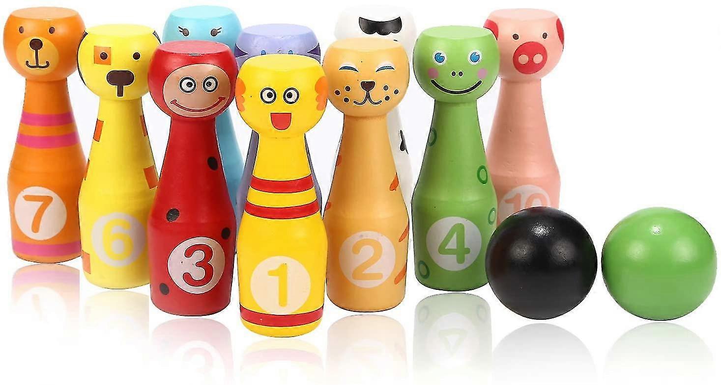 Wooden Bowling Set Skittles Toys With 10 Animal Pins 2 Balls Educational Toy Gift For Kids 2+years And Up