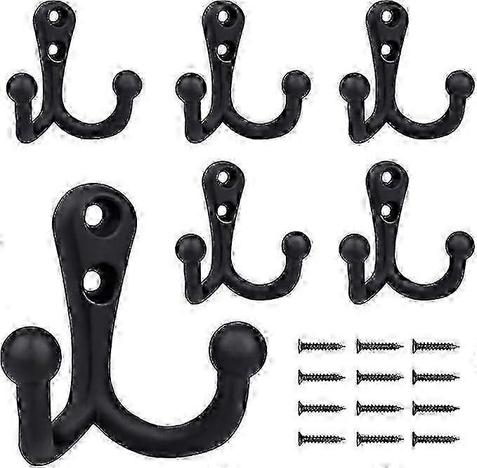 Curved Robe Hooks, 6 Pieces Coat Racks, Vintage Black Double Wall Hooks with 12 Screws for Coat Racks, Bathroom, Kitchen, Office
