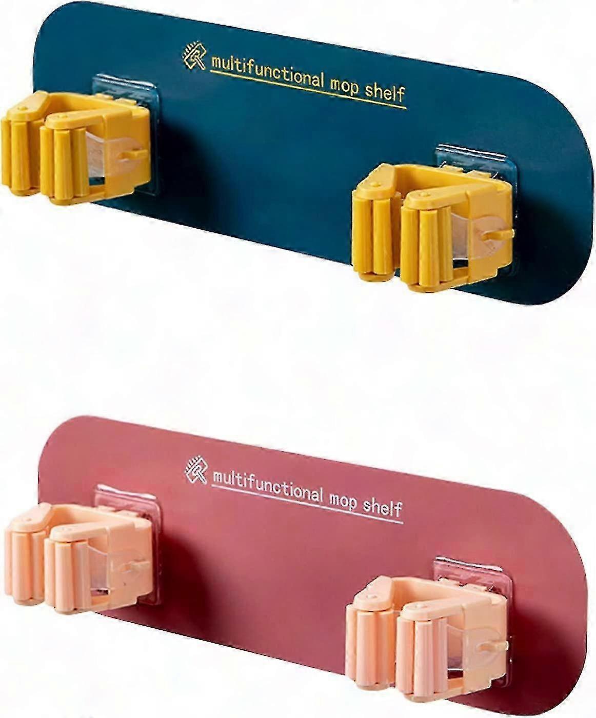 Sticky Wall Hook for Mop Broom Hanger - Plastic Mounted Rack 2pcs (Blue Yellow + Meat Meal)