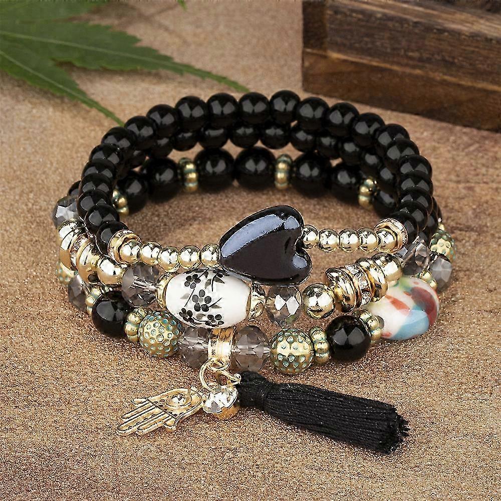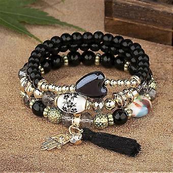 Vintage Bohemian Multi-layer Bracelet Heart Pendant Tassel Beaded Crystal Elastic Bracelet