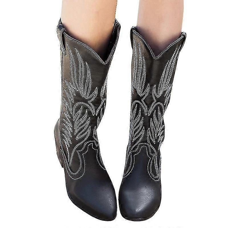 Vintage Women Western Cowboy Boots Point Toe Embroidery Wide Mid Calf Shoes