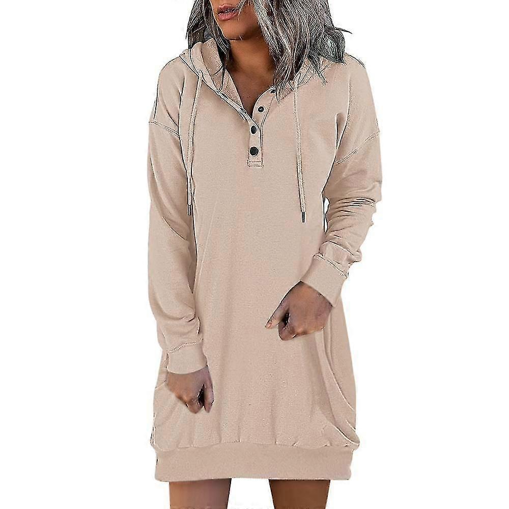 Vintage Women Solid Hoodies Dress Autumn Winter Button Loose Hooded Sweatshirt Dress Long Sleeve Harajuku Long Tops Tunic