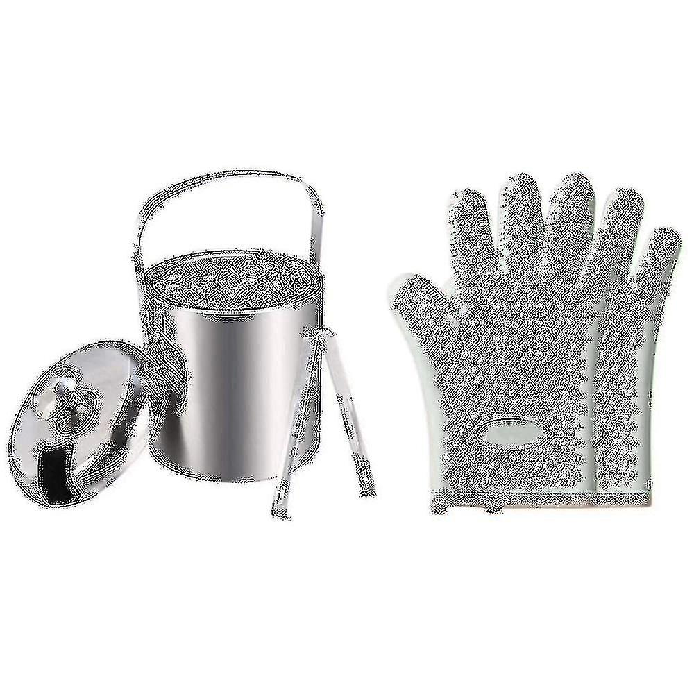 1 set Ice Buckets with Ice Tongs & 1 pcs Silicone Heat-Insulating GlovesPerfect Safety Protection: which can be used in the kitchen and barbecue. The inner lining of the gloves and the outer silicone layer are excellent for heat protection, which can protect your hands from high temperatures, while the silicone pad can protect your precious or beautiful tables.Multifunctionality: you can use this glove to handle food on any high-temperature oven, stove or grill, without hurting your hands or pot, and you can also take things from hot water. High Quality: Each piece is made of soft and durable silicone material, with high-quality soft cotton inside, high temperature resistance, easy to clean and more durable. The cotton cloth inside makes you more comfortable without feeling like plastic or sweating.Exquisite Design: five-finger silicone gloves, both the front and back of the outer layer have the texture of bumps, and the anti-slip is very prominent. For smooth objects, the grip, control and stability can make you more assured. Gloves are designed with hanging holes for easy storage and make you more worry-free.Wide Application: heat-resistant gloves make you safe and comfortable during cooking, baking, grilling, hot water, opening cans or other housework, and are very suitable for moving or fixing hot pots, plates, cutlery or tableware.ice bucket + ice clip:Made of stainless steel, is perfect for keeping and serving cold drinks.The sturdy stainless steel top handle is more convenient as well as the flip-top lid for easy access and secure closure.The solid stainless steel tongs with sharp teeth can easily grab ice and attach to sides of Bucket.size:19.5 x 14cmMaterial: stainless steelcolour:Silveranti-scald gloves:Colour:greenMaterial:Silicone + CottonSize:28 x 14cm Package Contents:1 * ice bucket (built-in ice compartment)1 * ice clip1 * anti-scald glovesOnly the above package content, other products are not included.Note: Light shooting and different displays may cause the color of the item in the picture a little different from the real thing. The measurement allowed error is +/- 1-3cm.