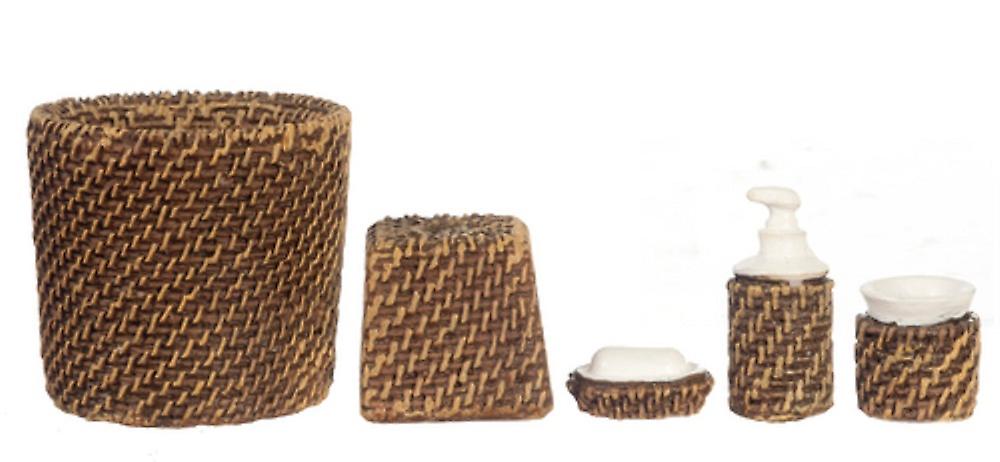 Dolls House Miniature Modern Wicker Bathroom Accessory Set Bin Soap Tumbler 5 Pc