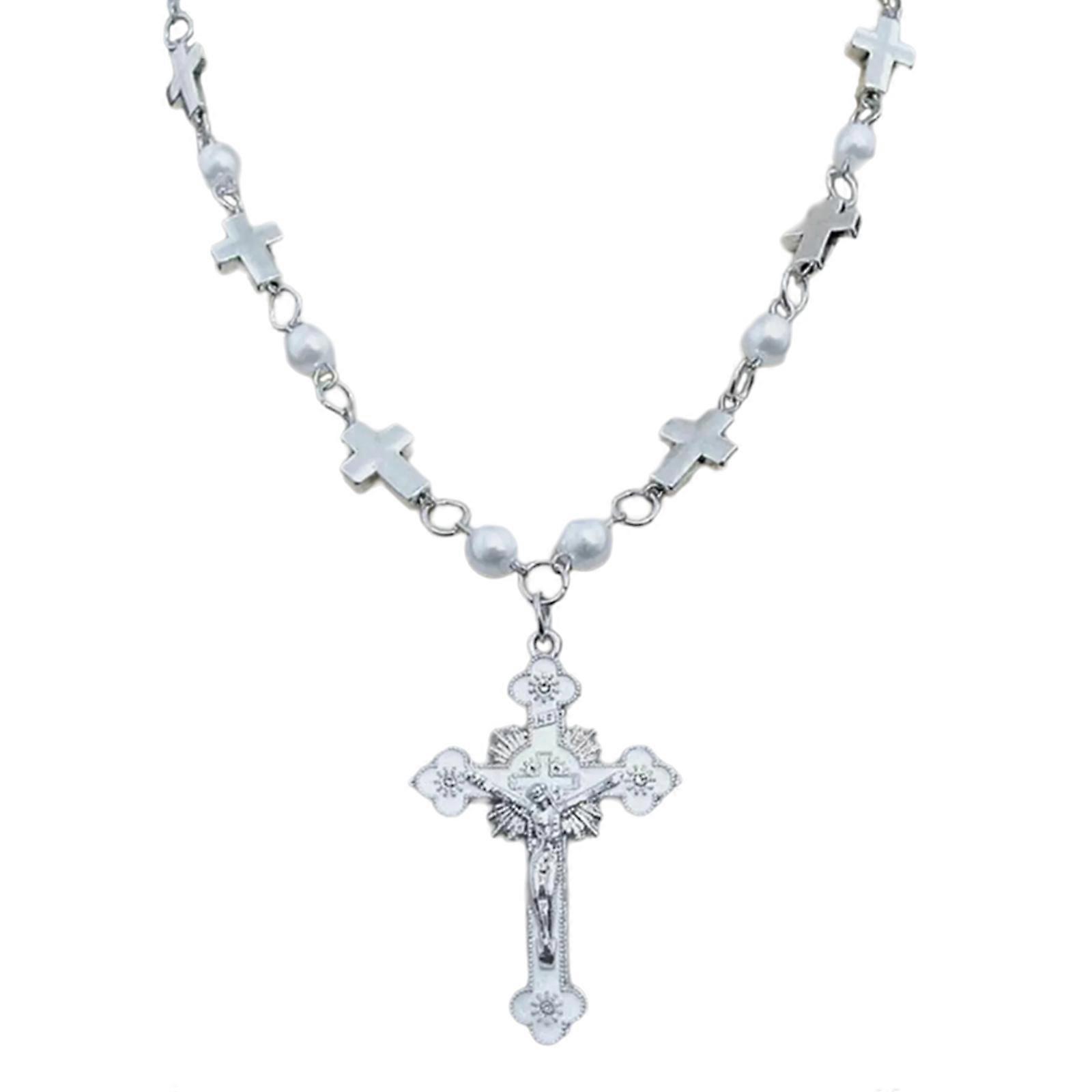 Religious Cross Rosary Necklace Pearls Bead Neck Chain for Collectible Handicraft Praying Meditations Baptisms Gift White