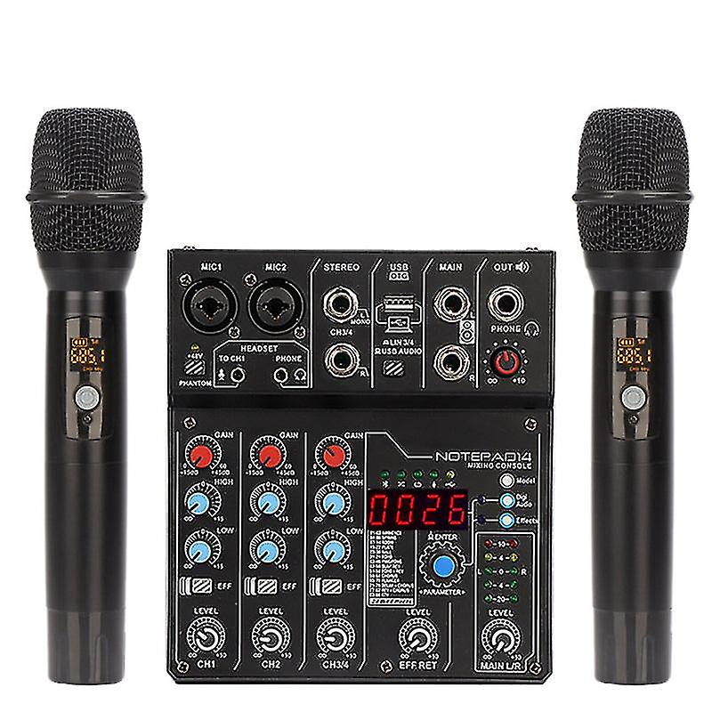 DJ Mixer controllers Complete Set: This 4-channel mini o mixer comes with 2 wireless microphones (built-in receiver 50 meters), features USB 48V phantom power supply, and the interface can be PC, the device for iPhone, for Android, laptop, game console, microphone, guitar, and those can be mixed together by users. This set can meet the needs of home music recording, internet radio, Karaoke, etc. Studio mixing desks Plug and Play: Use a computer, USB AC/DC power plug, direct power supply for charging. Built-in universal drive, plug in and install it automatically. Easy to use. Powerful o Mixer: This o mixer supports MP3, WAV, lossless APE, FLAC and other o formats, recording via USB, connecting to computer to play music recording, individual +48V phantom power supply and UHF switch. Built-in bluetooth function, support most electronic devices to connect wirelessly with bluetooth function, fast fit. Support U disk mobile storage device, you can store music on U disk and insert games. Smart multi-device compatibility: wireless microphones, power amplifiers, mobile phones, computers, electronic instruments, wired microphones, o Potentiometer knob type, non-slip design of concave and convex surface, better feel and more accurate adjustment. Can be connected to wired/wireless/condenser microphones, suitable for KTV home, tuning, network host, broadcast transmission, recording, etc. Frequency response: 20hz 20 20khz 0.0.5db S/N Ratio: 80-80db Max outputs: 4v/max. Input/Output Impedance: MIC: 2.4KΩ Mono: 11KΩ Stereo: 100KΩ Parametric EQ: Hi: 12khz 1515db Bass: 80hz/1515db Smart multi-device compatibility: wireless microphones, power amplifiers, mobile phones, computers, electronic instruments, wired microphones, o size:175x160x40mm Material:Metal colour:Black Package Contents: 1 x mixer 2 x microphones 4 x anti-skid rings 1 x usb cable Only the above package content, other products are not included. Note: Light shooting and different displays may cause the color of the item in the picture a little different from the real thing. The measurement allowed error is +/- 1-3cm.