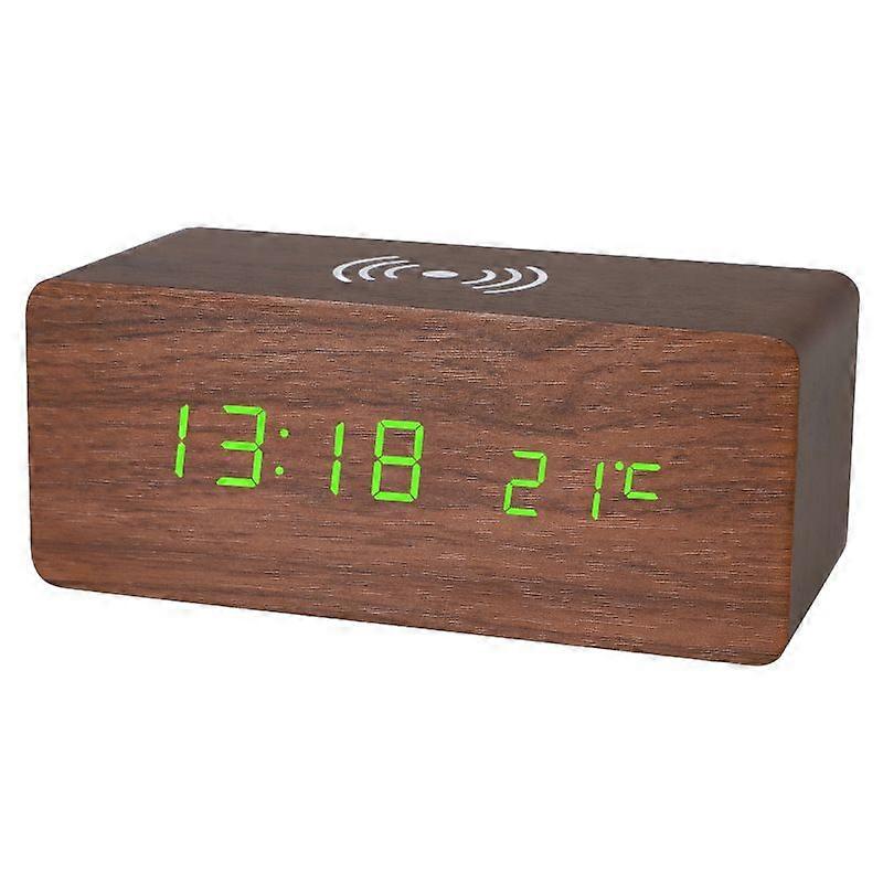Wooden Digital Alarm Clock FM Radio,10W Fast Wireless Charger Station for iPhone/Samsung Galaxy,5 Level Dimmer,USB Charging Port,2 Wake up Sounds,Bedr