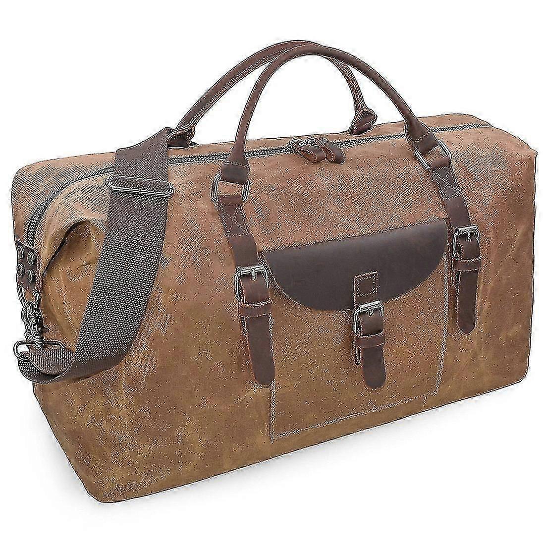 Men's Leather Travel Duffle Bag Waterproof Large Canvas Weekender Overnight Camping Bag (Brown)
