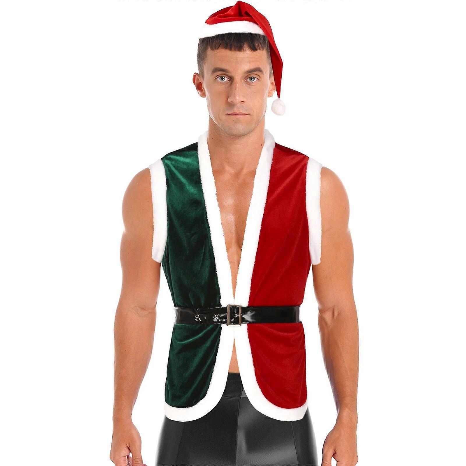 Mens Christmas Elf Santa Claus Cosplay Outfit Velvet Color Block Open Front Vest Sleeveless Flannel Trimming Tops with Belt Hat