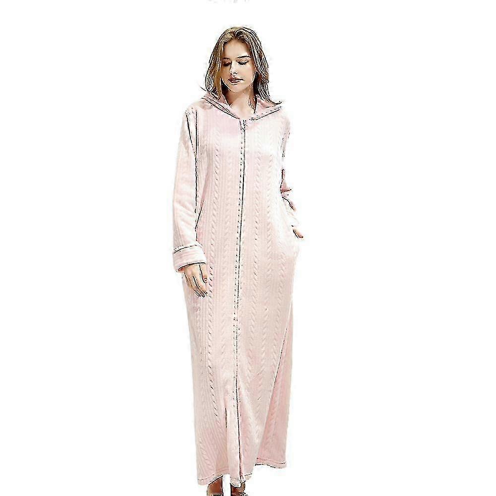 Women Long Hooded Dressing Gown Nightgown Flannel Bathrobe Zip Robes