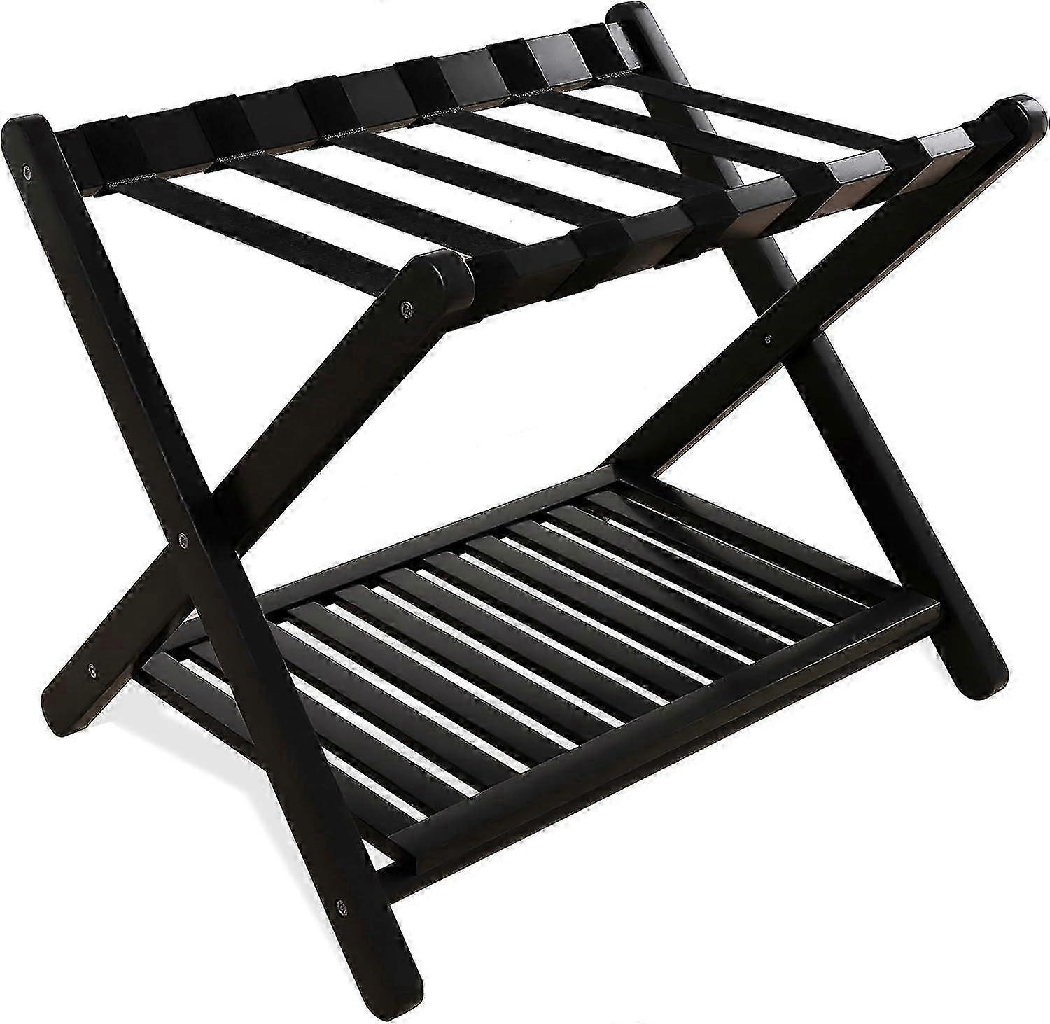 AURA Luggage Rack, Foldable Bamboo Suitcase Stand with Storage Shelf for Guest Room, Bedroom, Hotel, Heavy-Duty (Black)