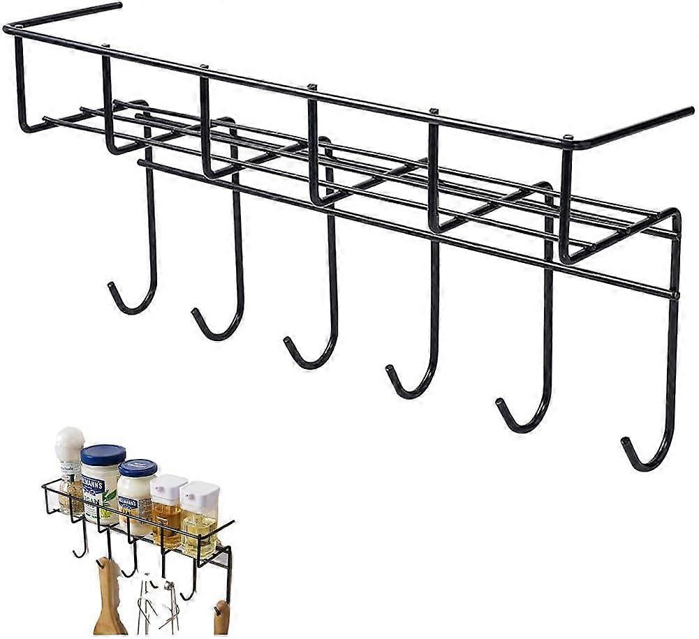 Spice Rack, Kitchen Wall Shelf with 6 Hooks, Self-adhesive Kitchen Shelf Wall-Mounted Saucepan