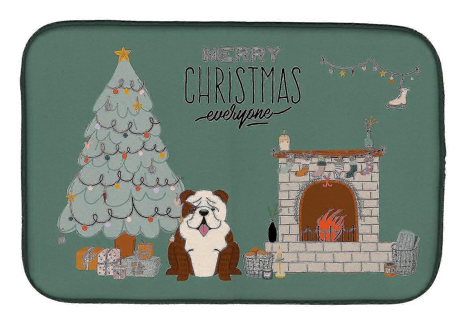 brindle White English Bulldog Christmas Everyone Dish Drying Mat