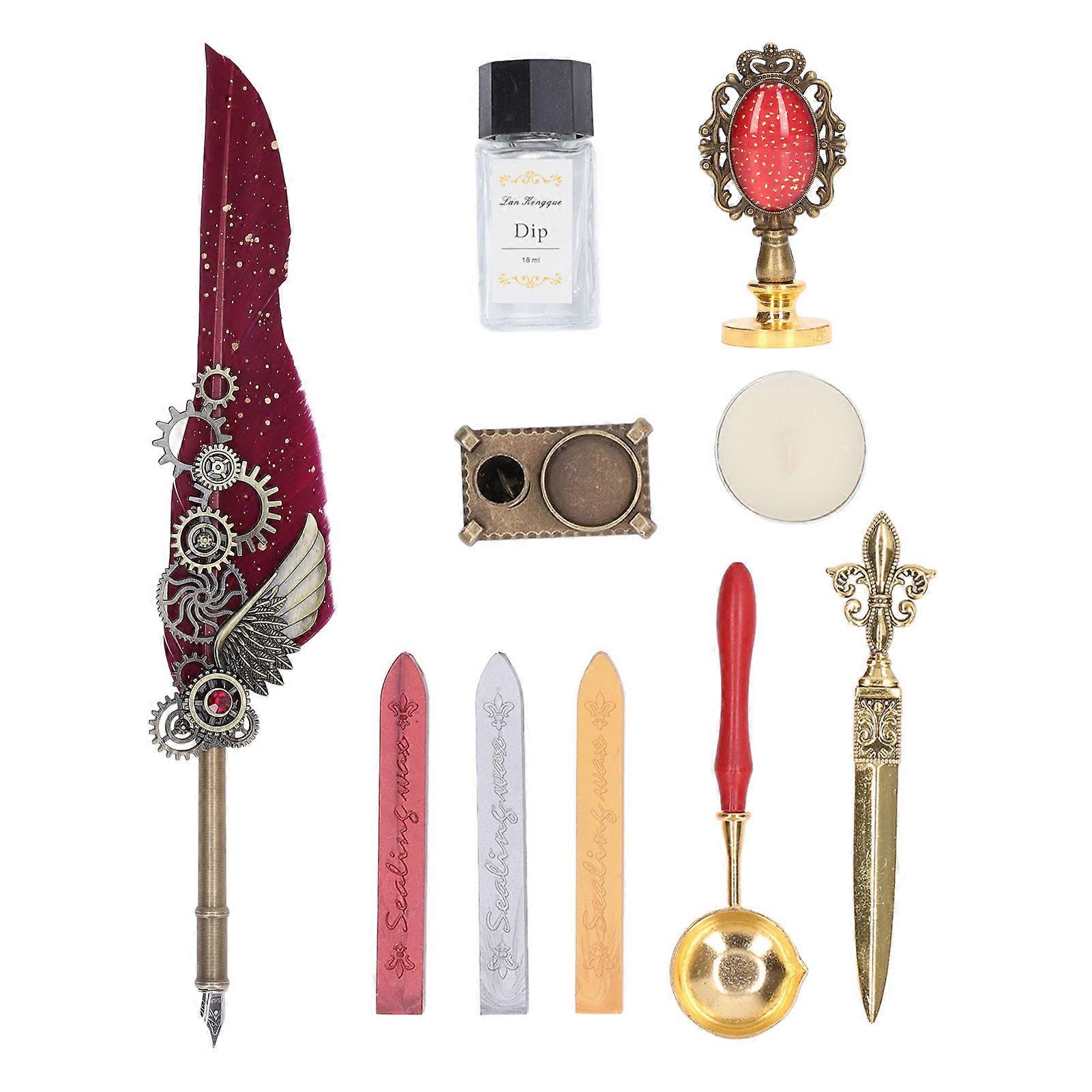 Quill Pen and Ink Set Vintage Style with Sealing Wax Stamp Glossy Quill Pen Wax Seal Stamp Set for Letter Envelope DIY Wine Red