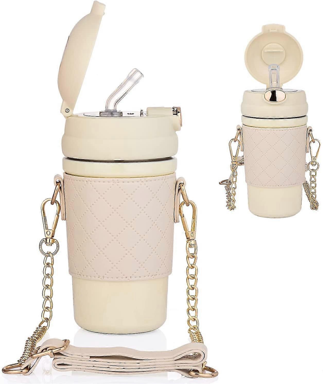 Insulated Water Bottle With Straw, Stainless Steel Thermos Bottle Sleeve & Carrying Strap,16oz/480ml (beige)-Yvan