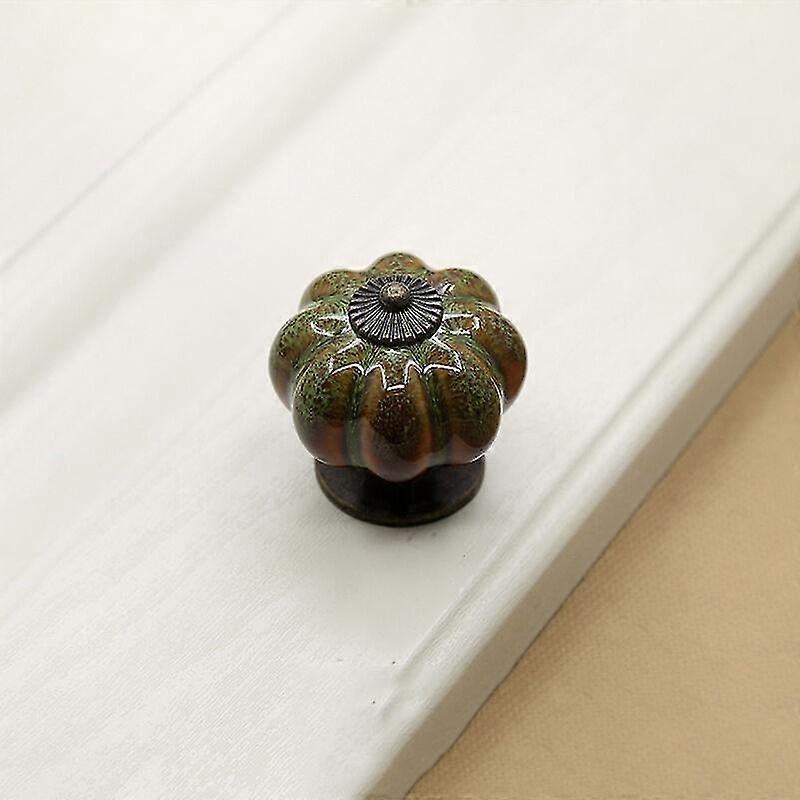 Pair of Ceramic Drawer Knobs, Pumpkin Design with Green Leopard Pattern, 3.8 x 4.0 cm Vintage Cabinet Handles (Includes Screws)