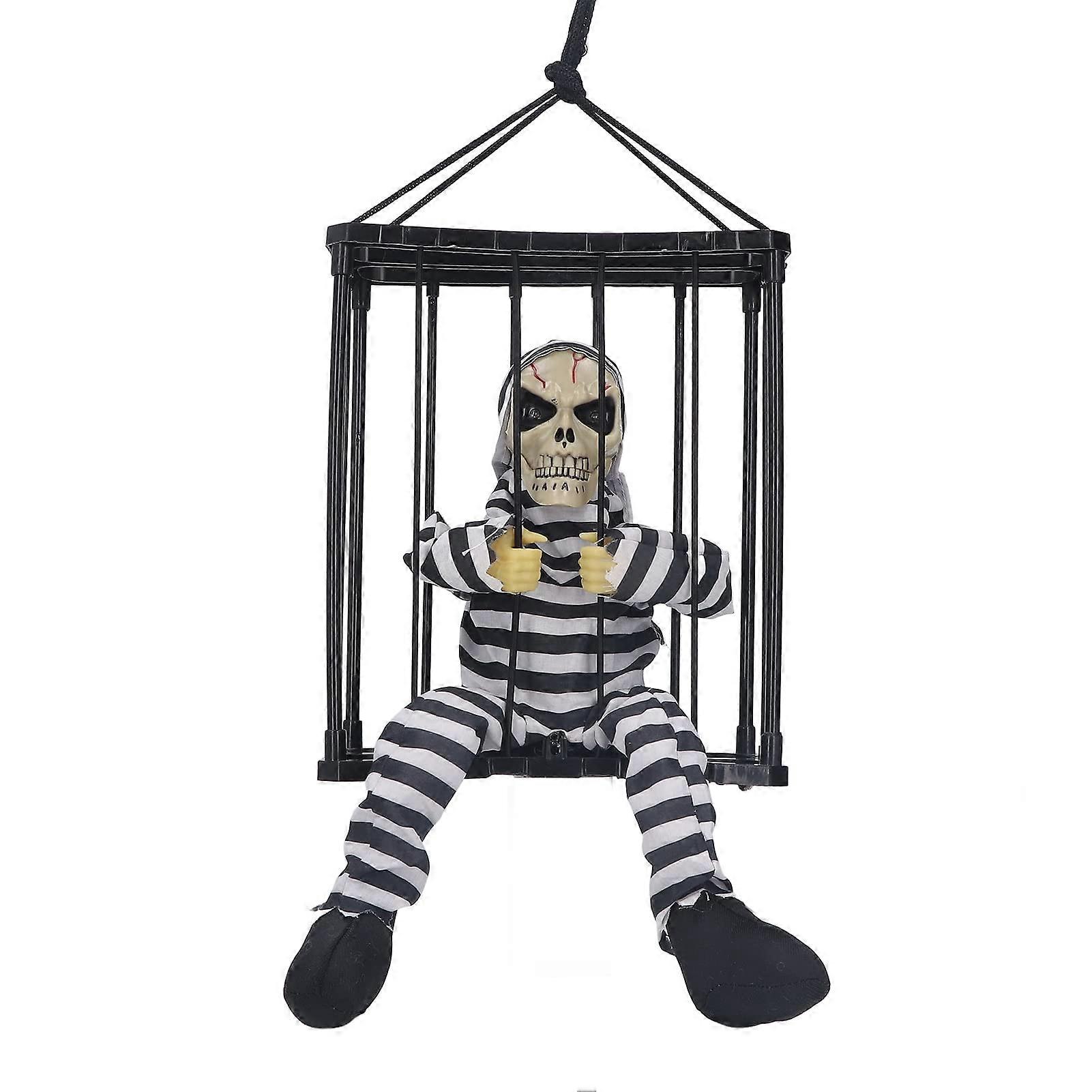 Skeleton Animated Halloween Decorations, Talking Skeleton Prisoner, Halloween Scary Skull Cage Prisoner with Light Sensor, Screaming Halloween Decor(#