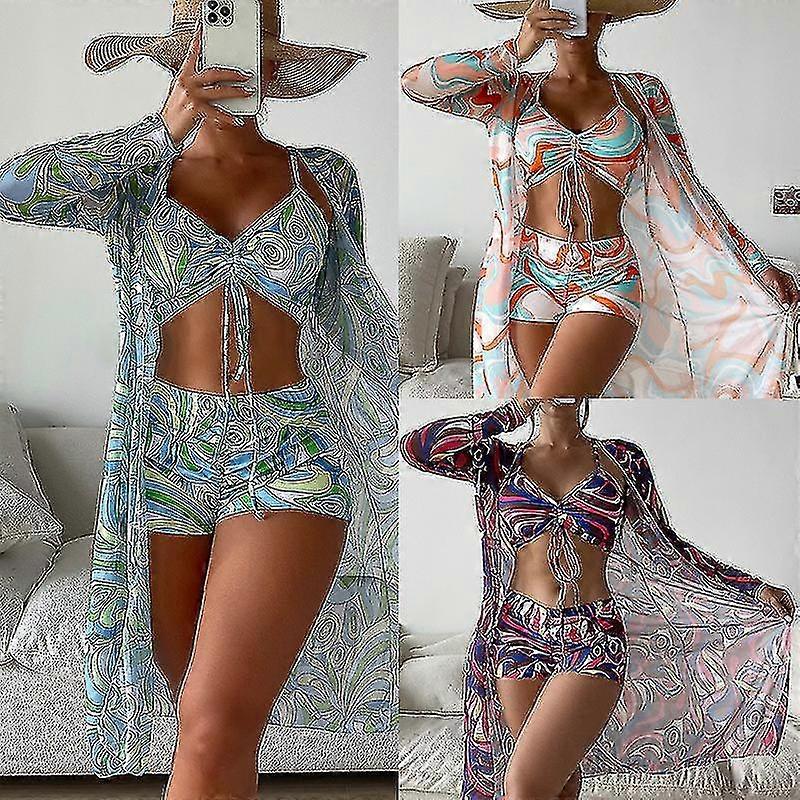 3-piece Women's Swimming Costume Split Top + Shorts High Waist + Long Sleeve Cover-up Drawstring Set A