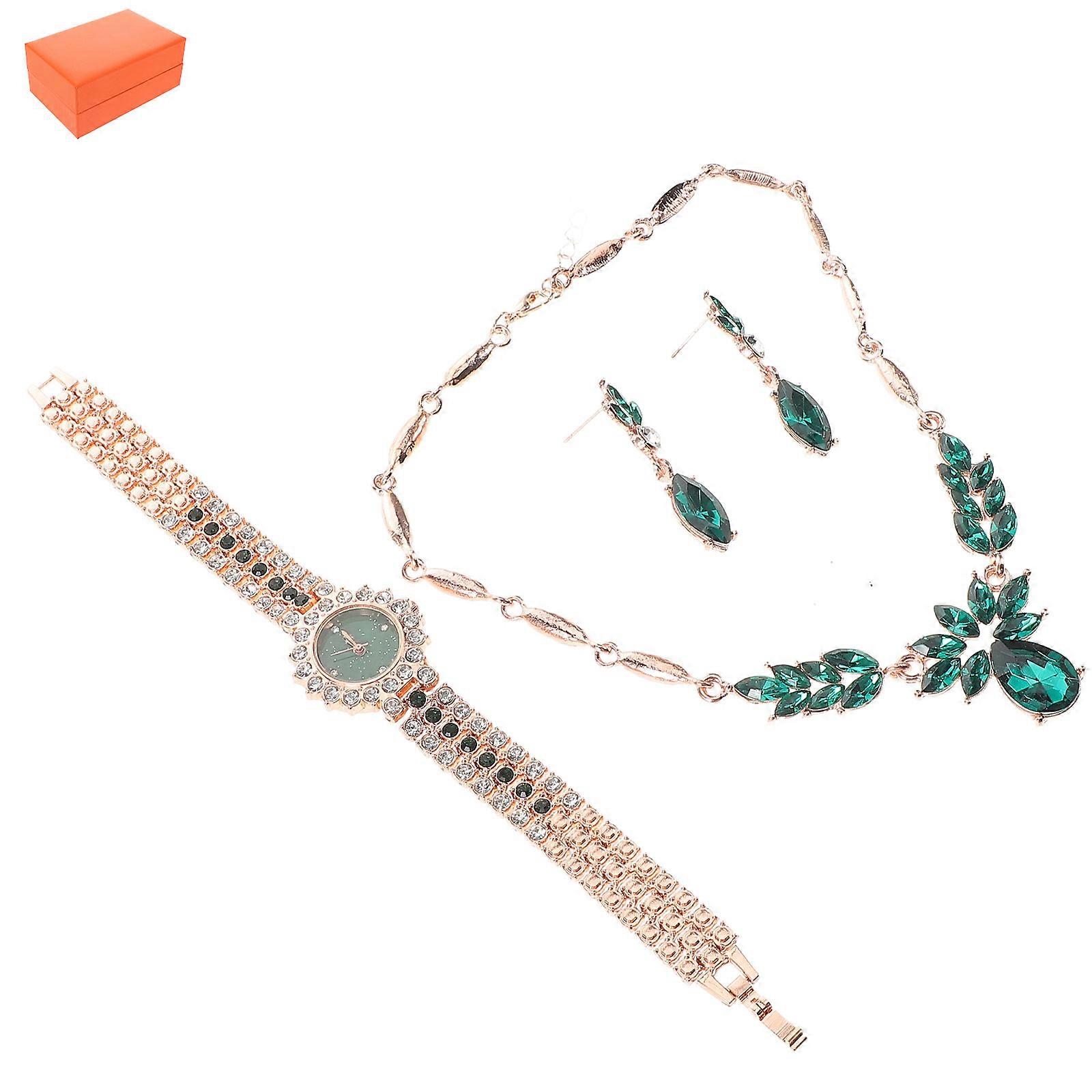 Bangle Watches For Women Elegant Green Jewelry Set Bridal Crystal Necklace Bridesmaid Earrings Watch 1Set