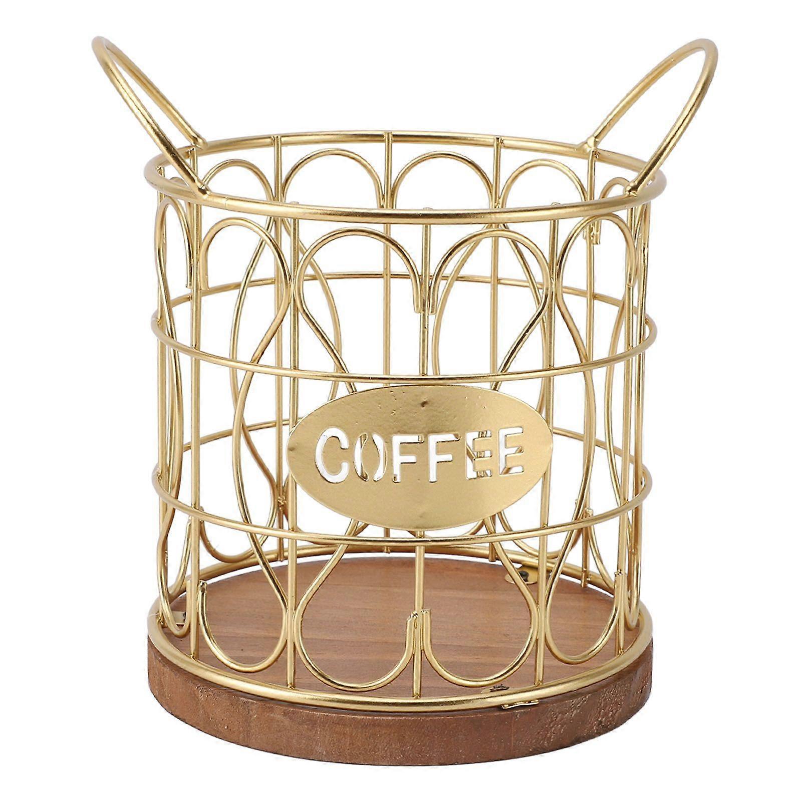 Coffee Pod Basket Decorative Round Wire Coffee Capsule Holder with Wooden Base for Cafe Kitchen Countertop Gold