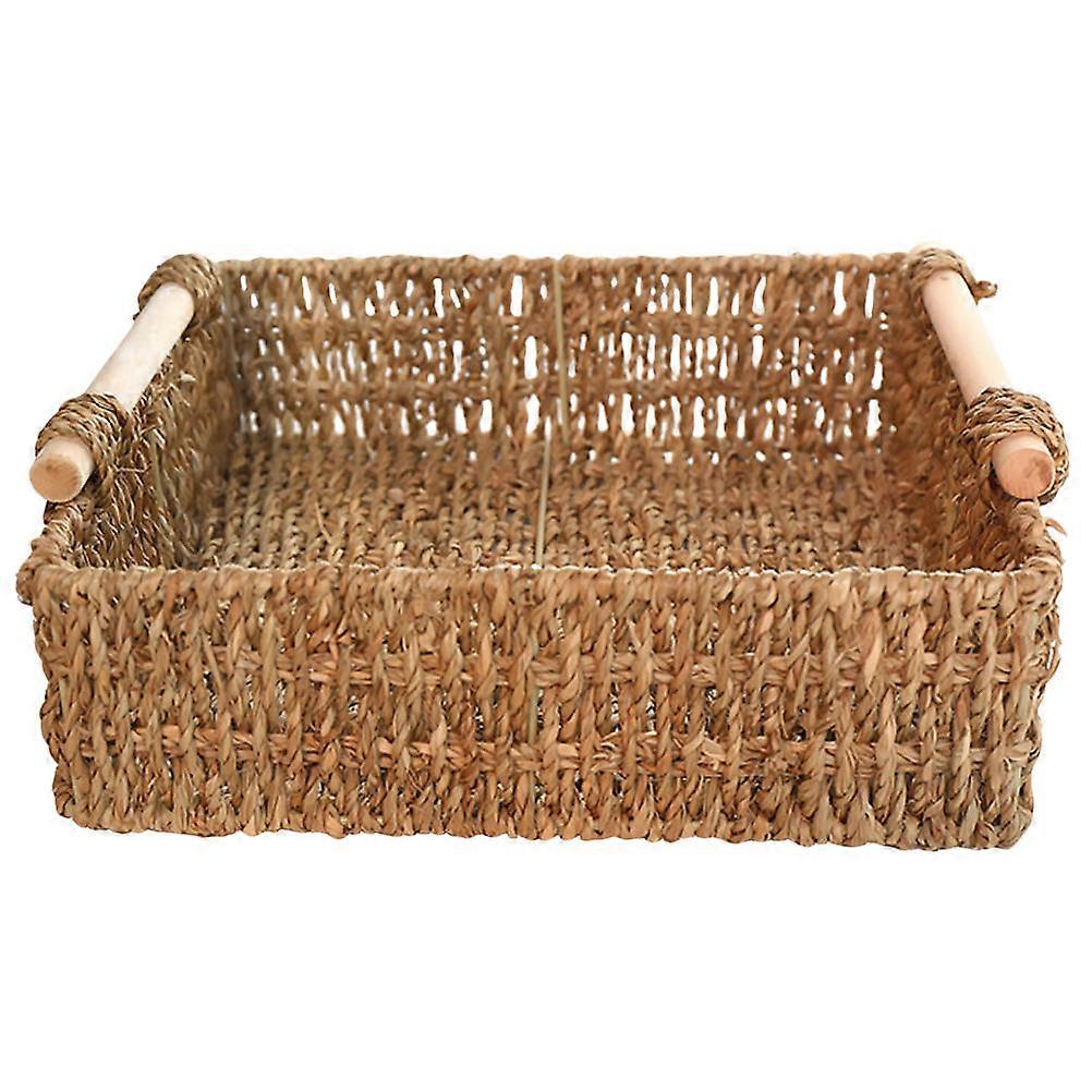 Large Straw Storage Basket with Wooden Handle Versatile Desktop Organizer for Cosmetics and Sundries, Ideal for Home Decoration and Space